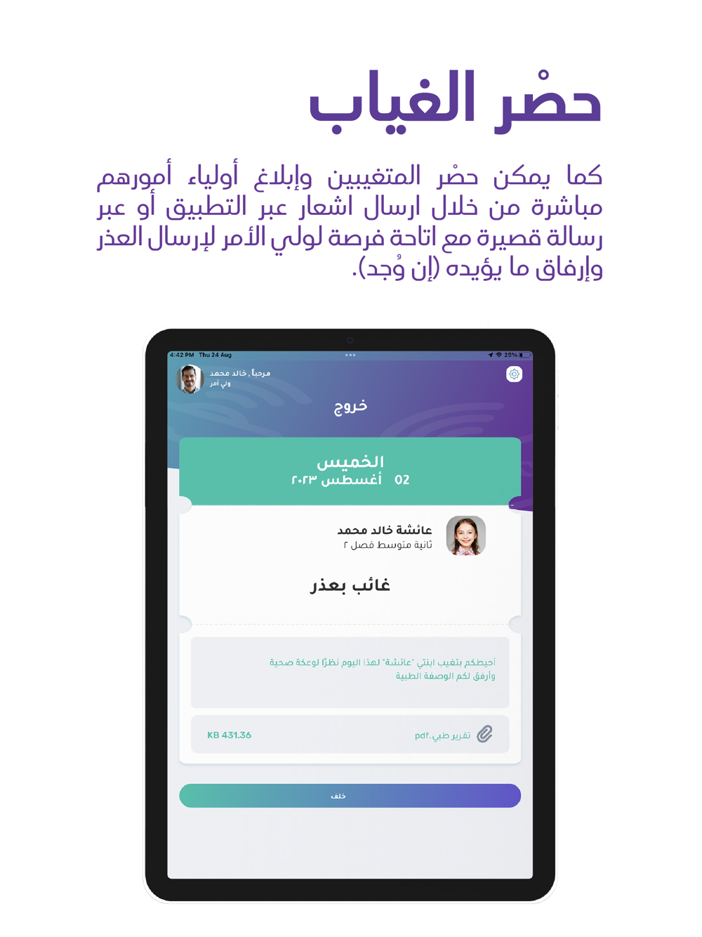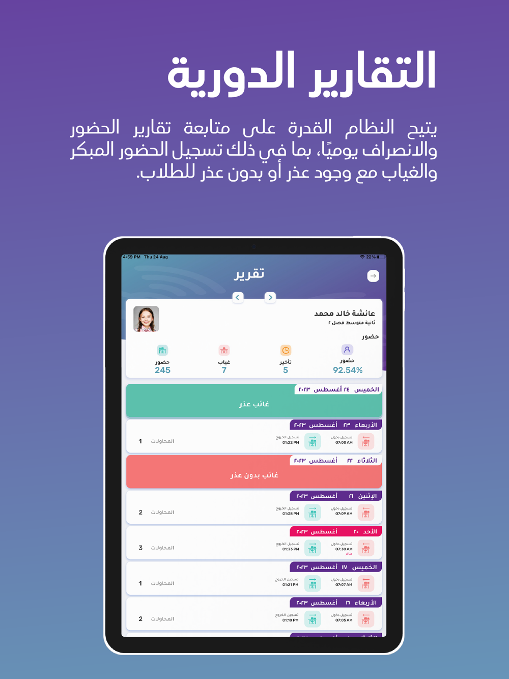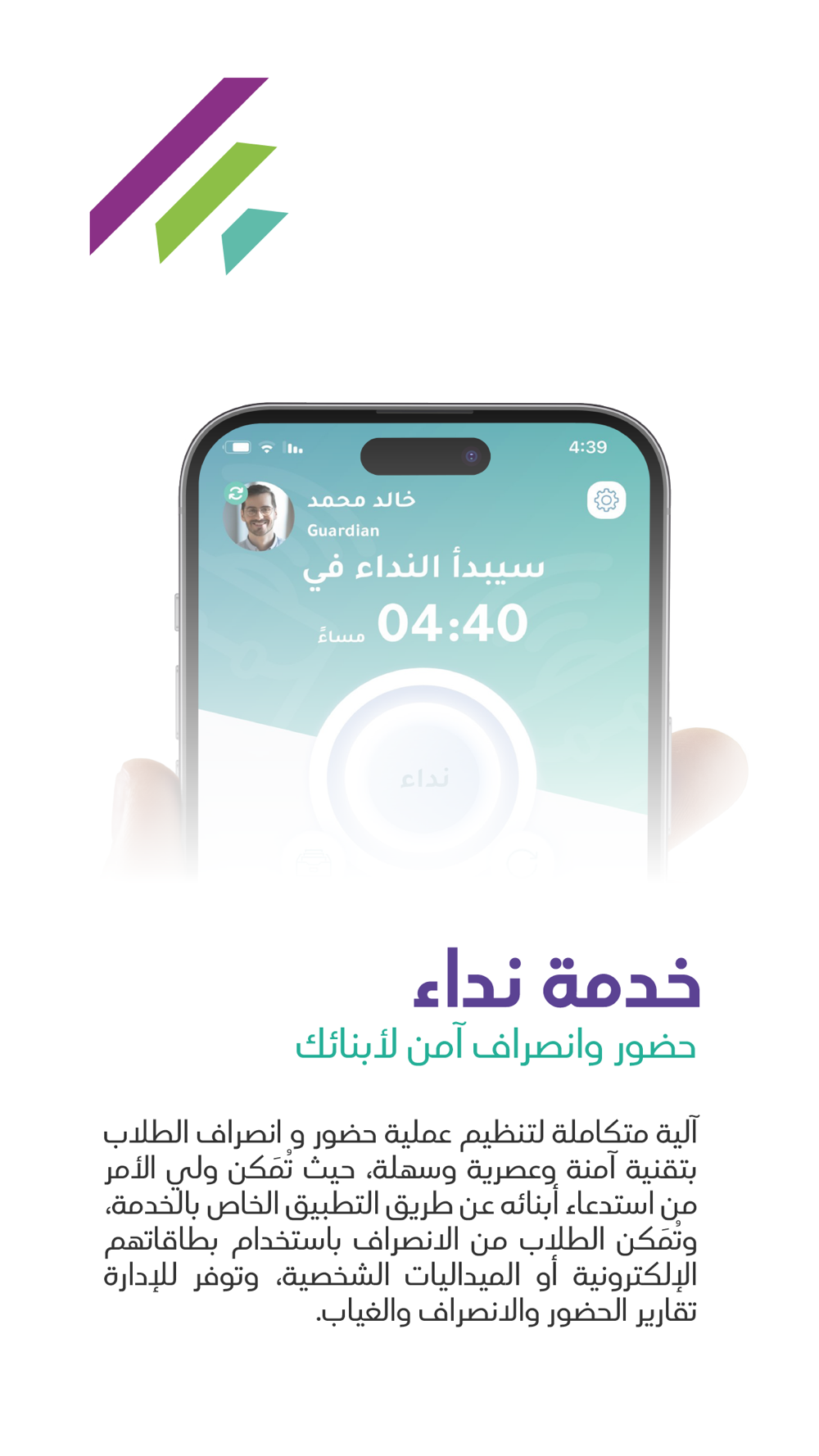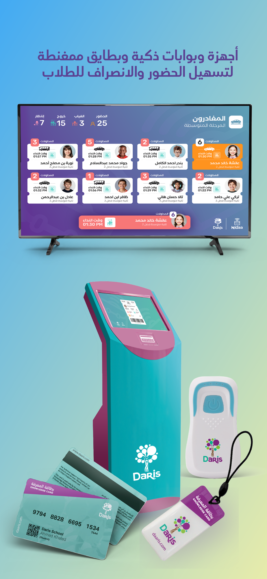 آلية متكاملة لتنظيم عملية حضور و انصراف الطلاب بتقنية آمنة وعصرية وسهلة، حيث تُمَكن ولي الأمر من استدعاء أبنائه عن طريق التطبيق الخاص بالخدمة، وتُمَكن الطلاب من الانصراف باستخدام بطاقاتهم الإلكترونية أو الميداليات الشخصية، وتوفر للإدارة تقارير الحضور والانصراف والغياب.