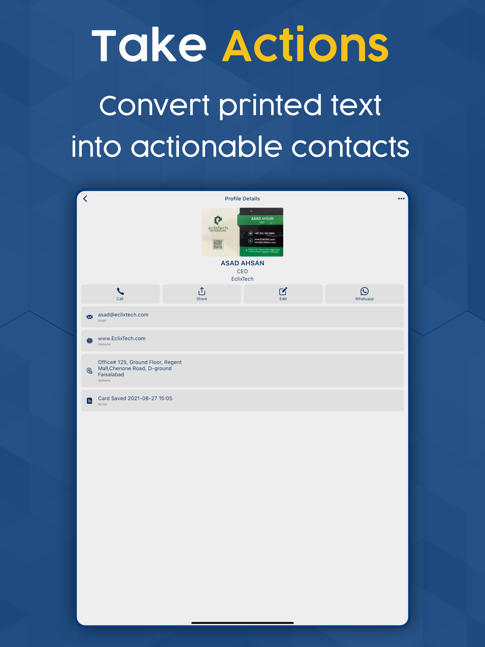 The business card scanner app for ios helps to scan business cards and organize the contact information into the contact list of your phone. The business card reader app uses your phone's camera for card scanning and stores the entire information in a digitized way and converts a card to a virtual business card.