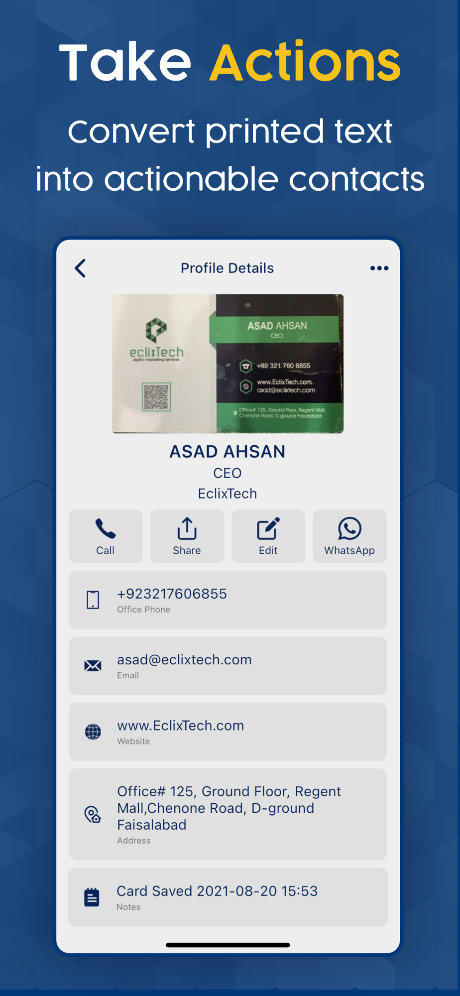 • The app uses advanced OCR technology to scan business cards, it recognizes the text of cards and transcribes them in digital form