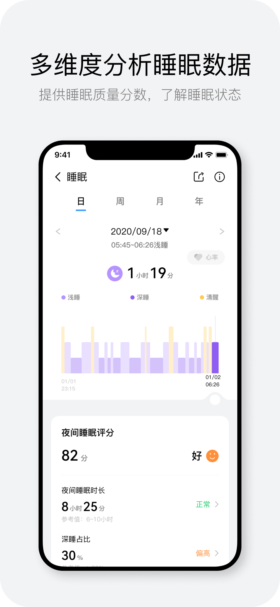 Record sleep information every night, analyze your sleep quality score by analyzing the proportion of different sleep in sleep, and provide corresponding sleep analysis and suggestions.