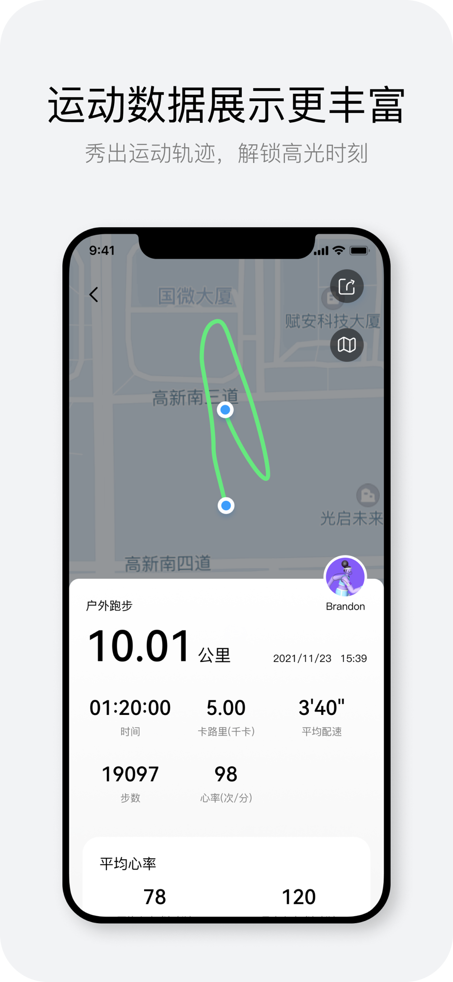 Support 100+ exercise modes, record data such as duration, heart rate, consumption, distance, trajectory, pace, exercise target, etc. during exercise, and support voice broadcast of exercise status.