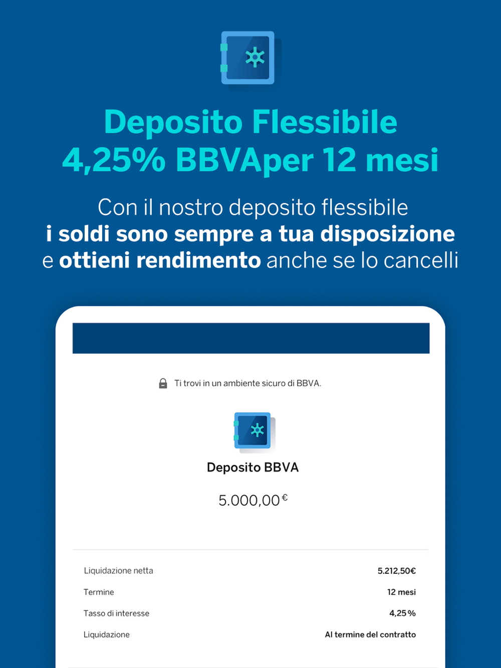 Con Deposito Flessibile BBVA 4,25% lordo per 12 mesi metti al sicuro i tuoi risparmi e se lo cancelli prima riceverai l’1% lordo sulla somma depositata. Non ha costi di apertura né di gestione.