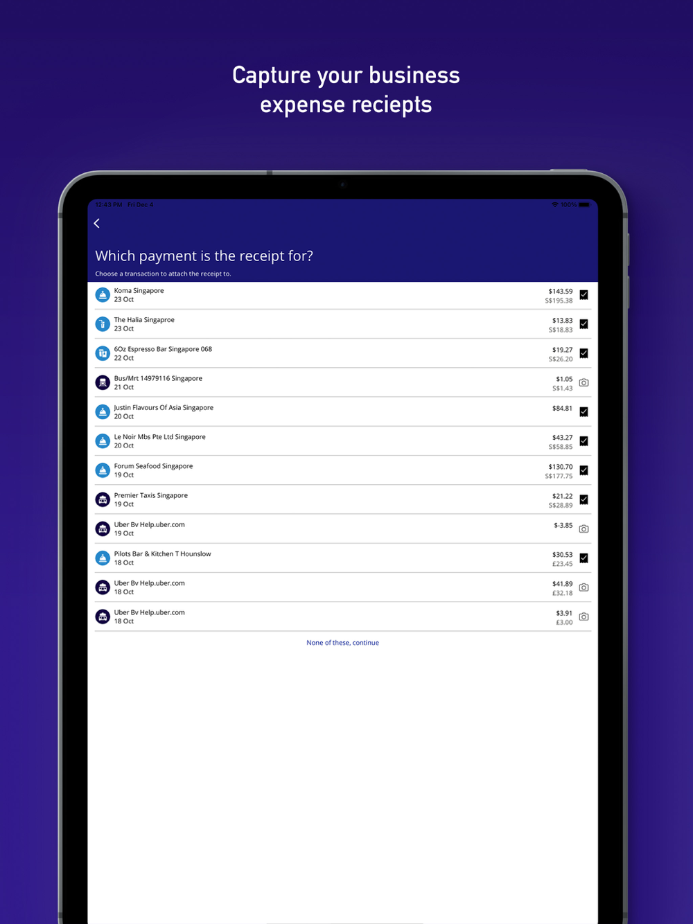 Notifications remind you to upload your receipts, which are then matched and attached to your transactions. No more paper.