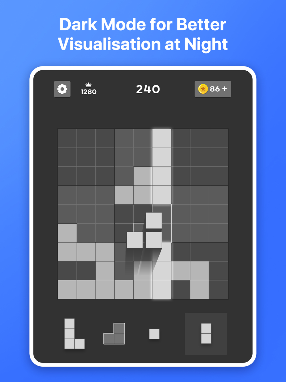 - Color themes. Choose between a minimalist cube block game or a classic wooden block puzzle.