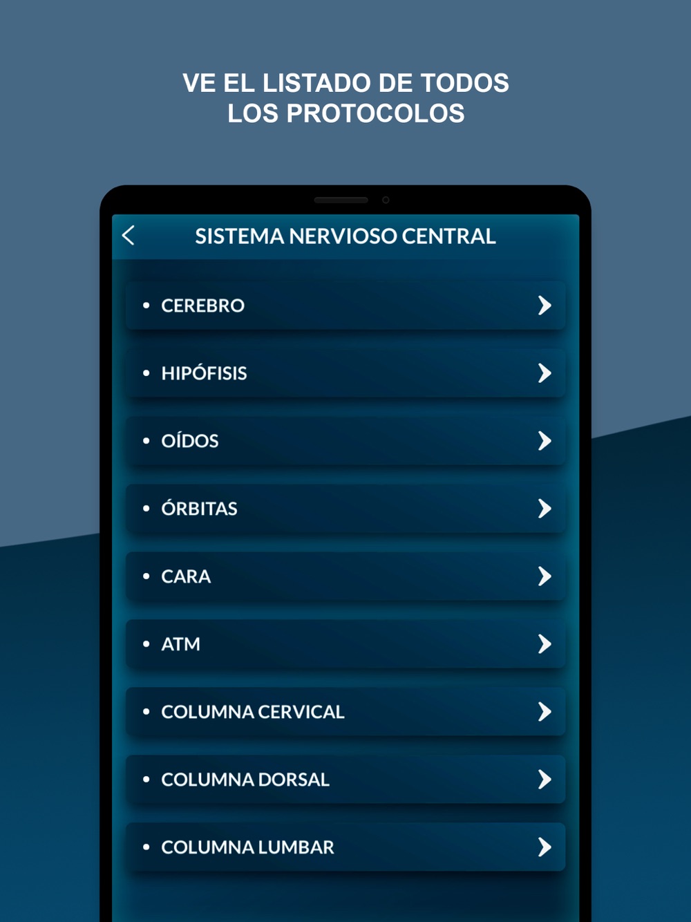 Within the app you will find the protocols divided by sections, Central Nervous System, Trunk and Osteoarticular.