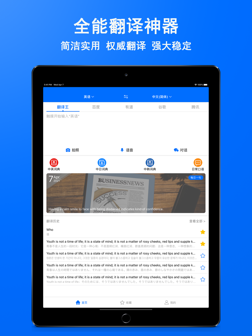 “翻译王”,别名“翻译大全”,一款整合接入百度、有道、谷歌、腾讯、搜狗、Naver Papago、Weblio等国内外翻译平台的应用,同时接入了英语、日语、韩语的国内权威词典,300+语种翻译,保留最最实用的功能,助力出国旅行外语学习。