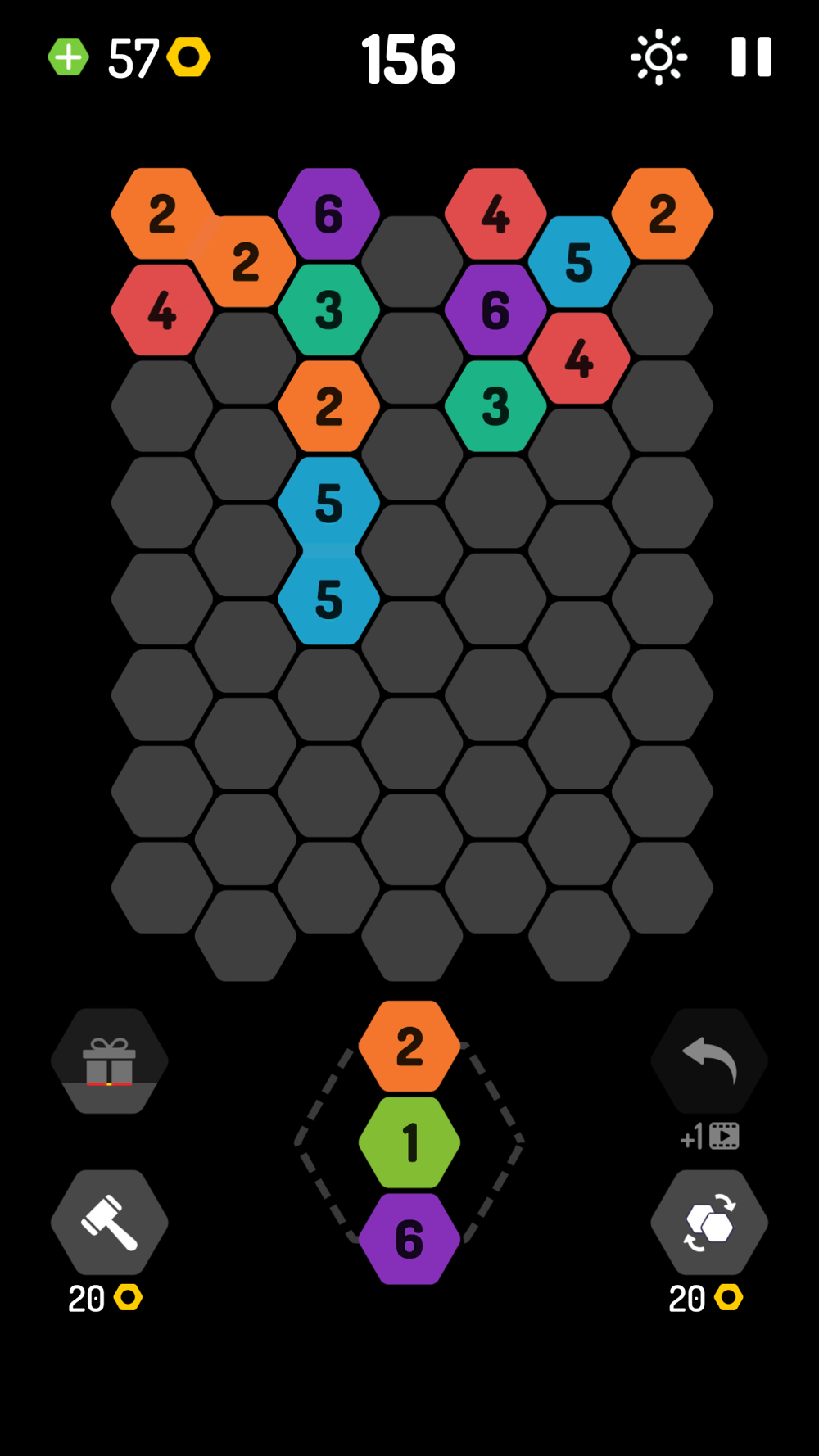 Place hexagonal blocks with numbers on the honeycomb grid. Collect the same numbers in the blocks in a row to combine them and get a nine. Be careful - the field can fill up quickly! This is a simple puzzle with a combination of hexagonal blocks and an excellent training for the brain.