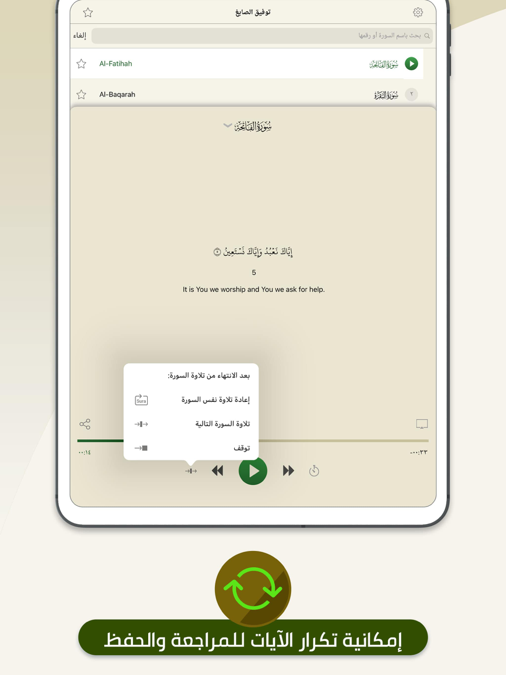 - إمكانية تكرار الآيات للمراجعة والحفظ.