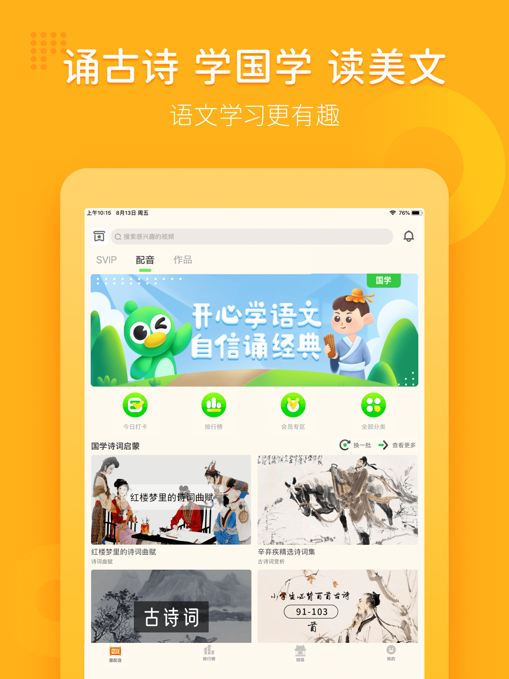 语文趣配音,一款适合全年龄段用户提升汉语国学能力的软件,由英语趣配音™官方出品。通过为中文热门影视、流行歌曲、课文诗词、经典国学、启蒙故事等内容进行配音,精选视频内容讲解,以趣味的短视频形式,培养汉语学习兴趣,养成良好学习习惯,帮助语言学习者提升中文发音及口语表达,深度理解汉语的语义和语境,拓展语言知识应用范围,学习中华文化。