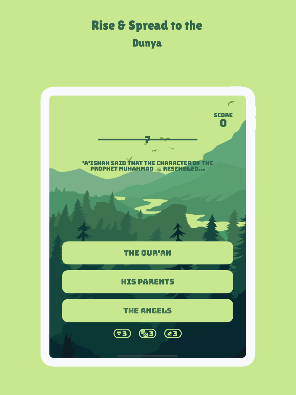 An Islamic trivia game that is easy to master for those who have the 'Ilm. Answer the questions, score points, earn coins, buy heroes and be amongst the top 4 players who know their deen.