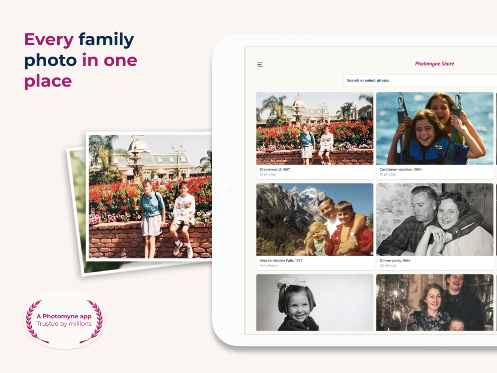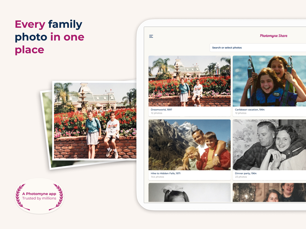 Photomyne Share is the app to view photos and photo albums scanned and privately shared by a Photomyne app user. It is the perfect app to see and celebrate the memories a family member or friend shared with you. This way you can enjoy the great memories right on your phone, and in the best quality.
