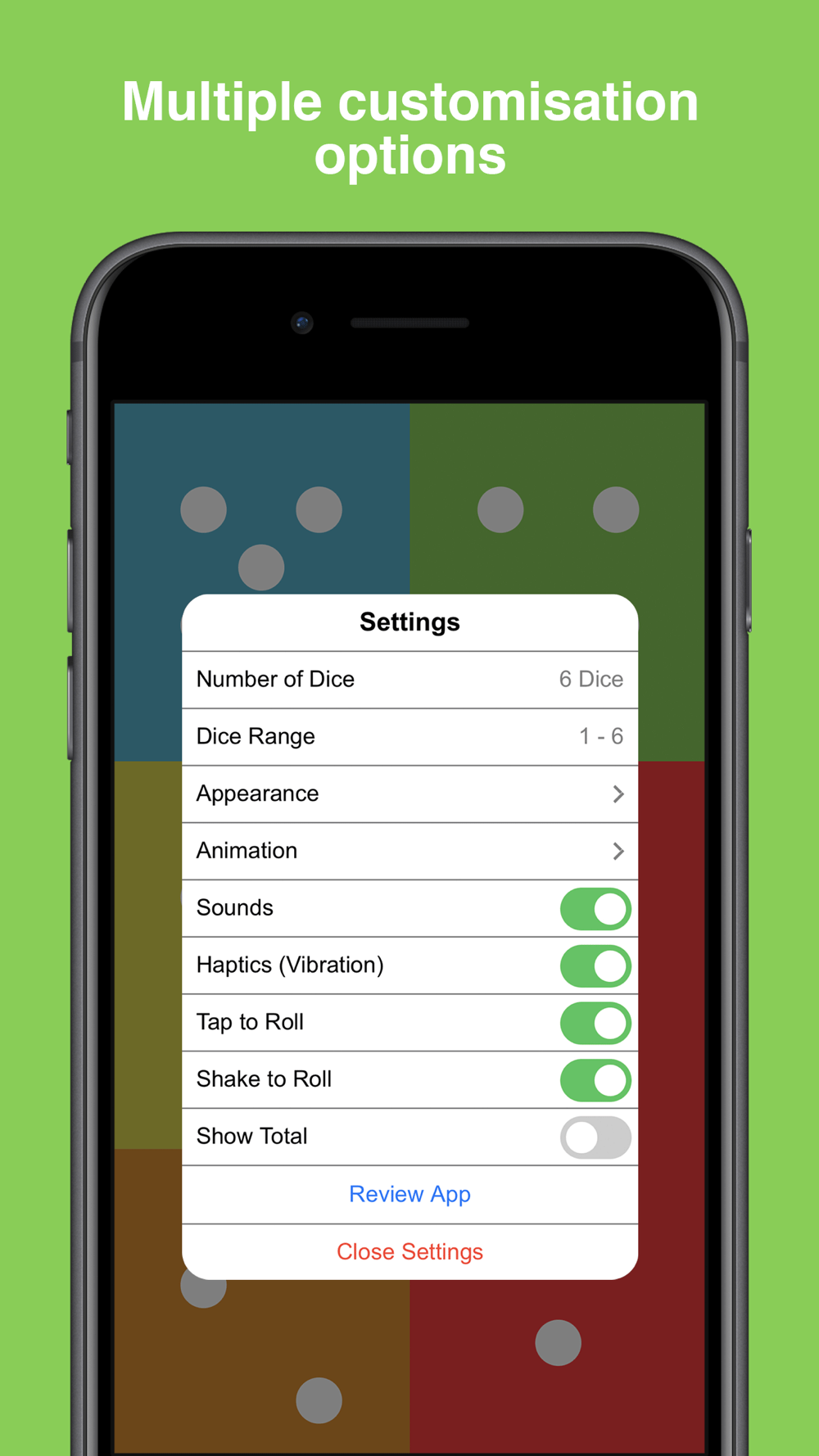 A dice rolling app to use instead of physical dice for a range of different board games. A variety of options are available to customize the experience to your preference! These include: