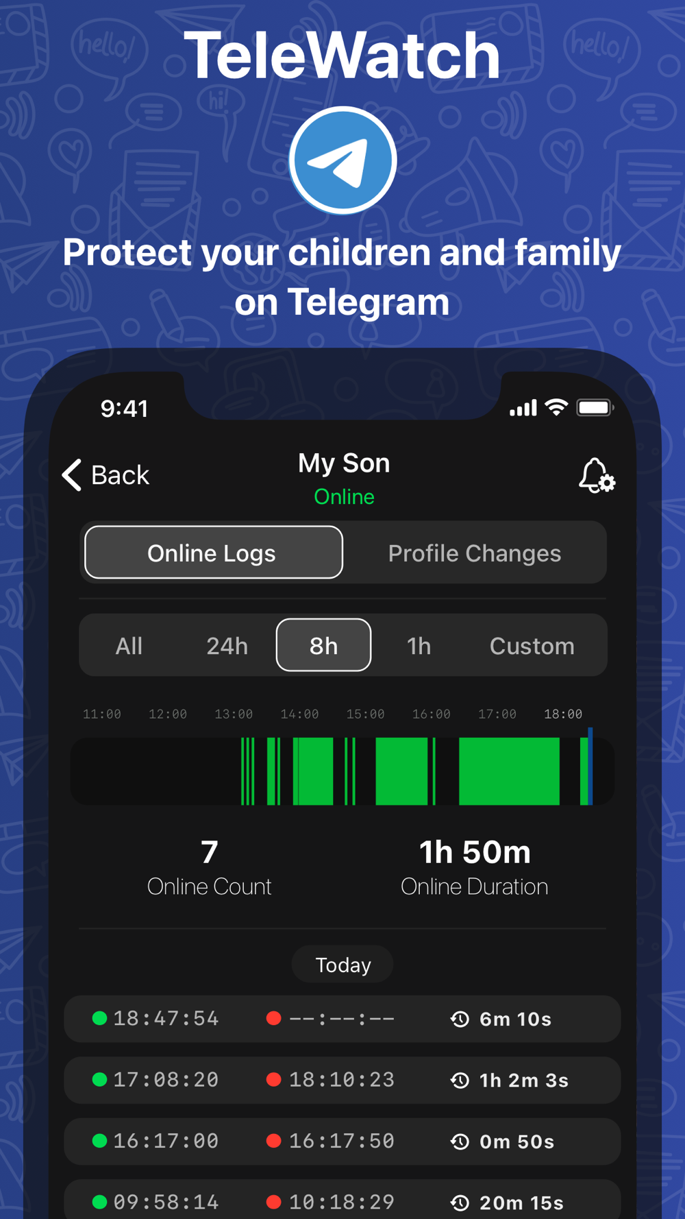 Are you trying to control the time you spend on social media and online messengers? Or maybe you are a caring parent that doesn't want their children to waste time? Then perhaps you will find the Parental Online Activity Tracker app useful for your needs. If you want to manage your time better, TeleWatch calculates the times you spent in the Telegram and takes care of your children's online activities in Telegram.