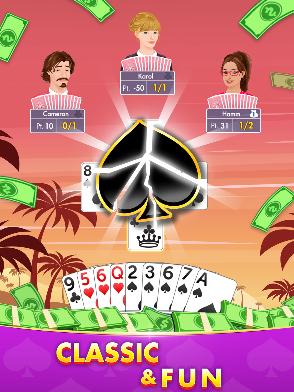 Spades Cash is playing in solo mode, each player gets his/her own points, then competing scores with players from all over the world, participating in tournaments to win cash prizes! More importantly, no ads interrupting your game experience! Download the game now and and compete to win CASH now!