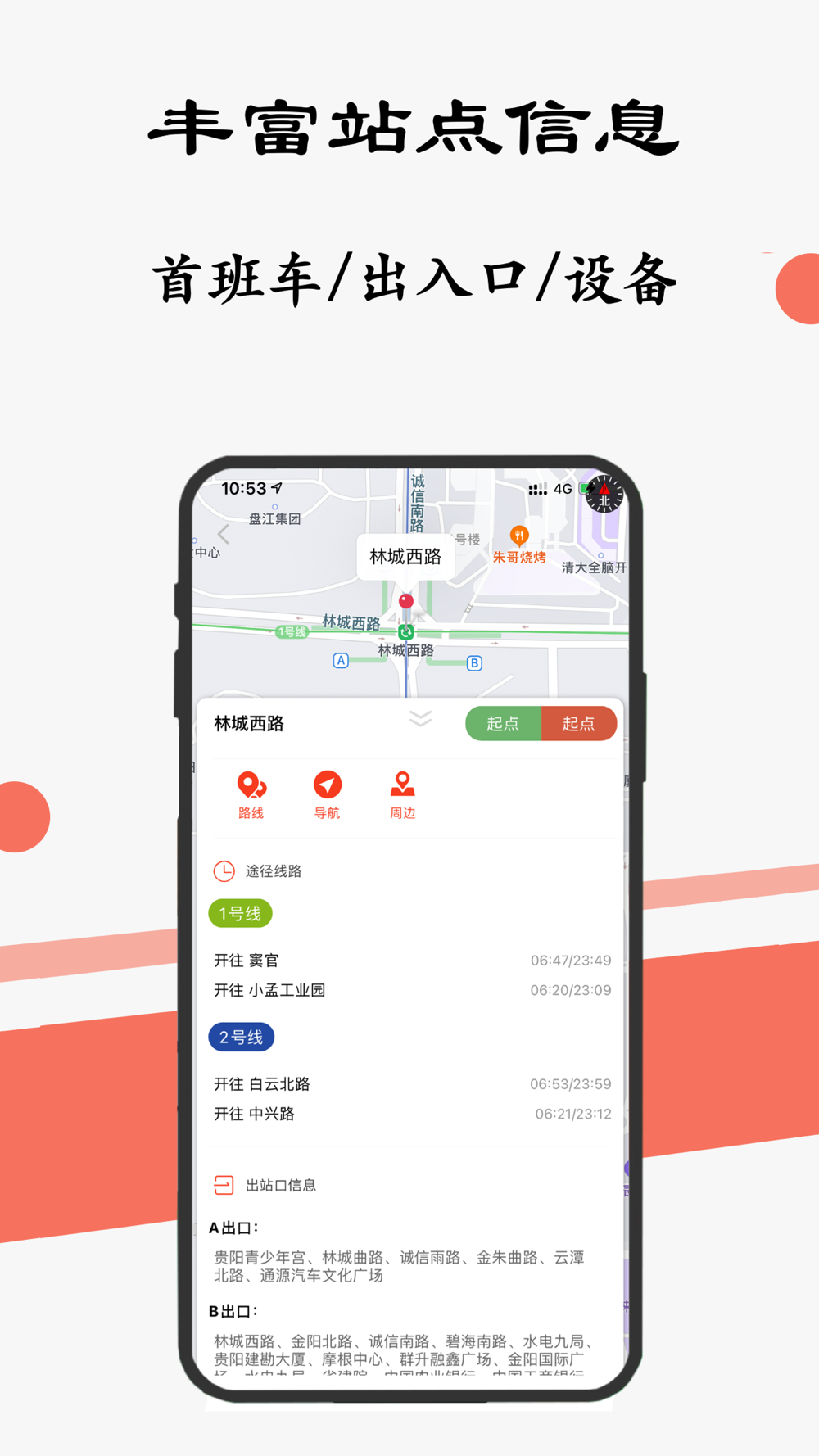 【站点详细信息】提供丰富的站点信息,包括首末班次时间、出入口周边信息及设施等,让您出入更方便。