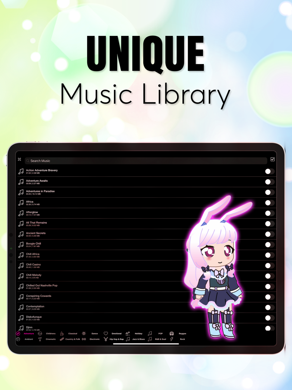 - Add your own music or choose from our music library with over 2000+ music and sound effects