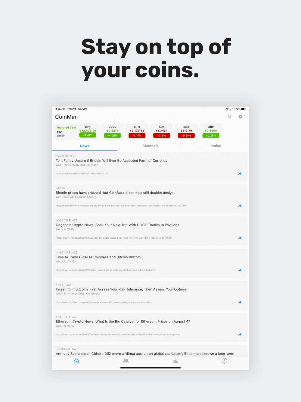 Keep track of all of your favourite coins and receive customized news and alerts based on the coins you follow. View news and live chatter from Twitter and Reddit regarding your watchlist.