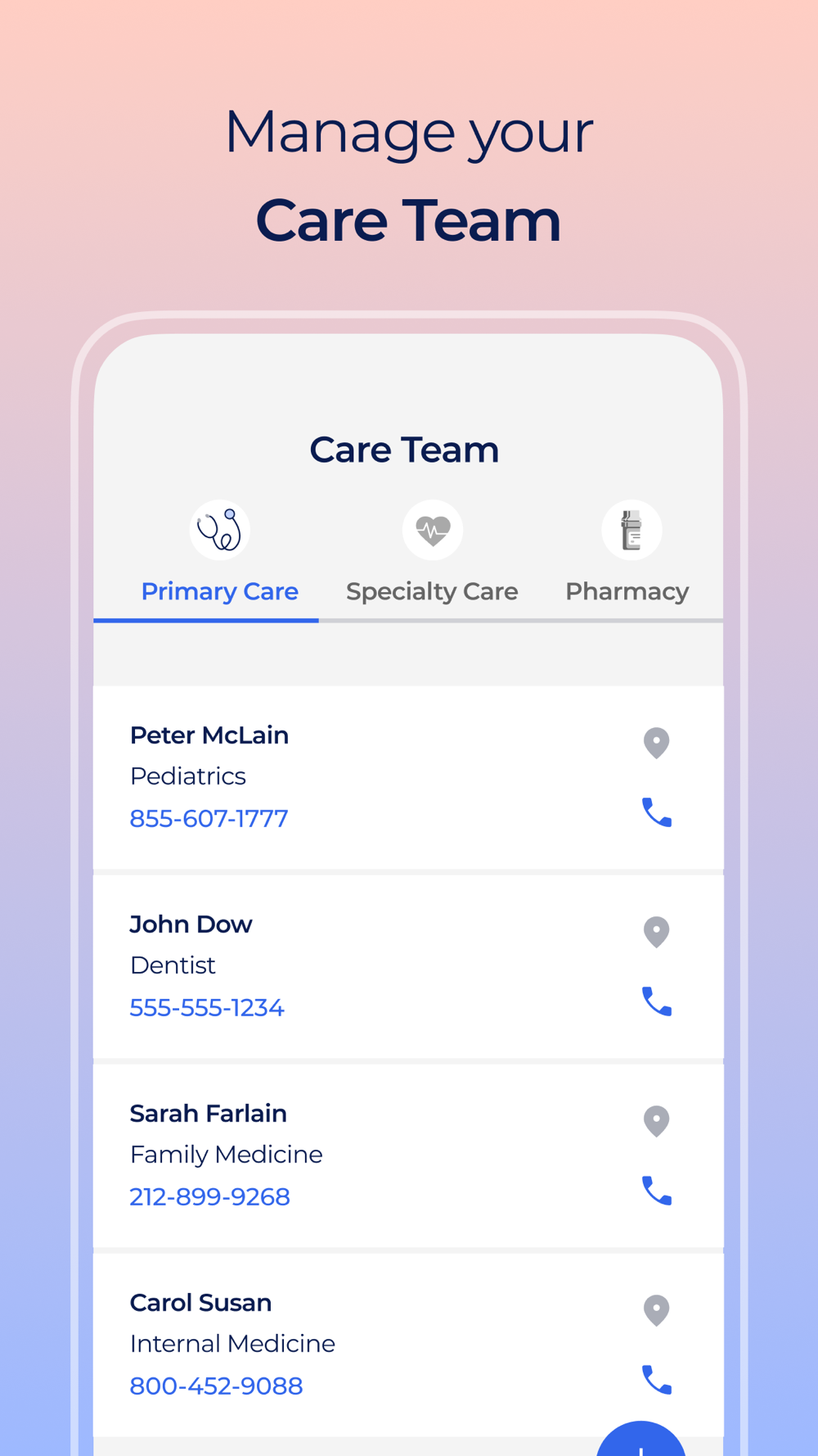 Organize your entire care team from primary care, specialists, pharmacy, labs and imaging centers within ALYKA so you can make your calls or get directions in one place.