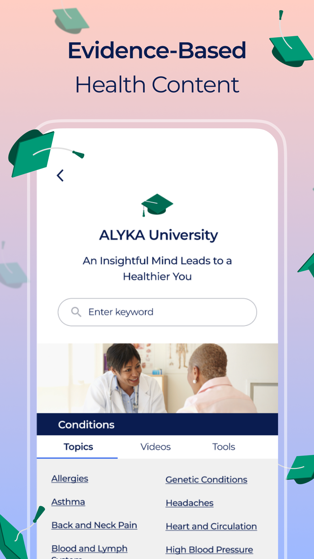 ALYKA Health integrates data from your responses to questions and surveys, your Electronic Health Record and home health devices. Now easily review your essential health data with insightful multi-media learnings in one place!