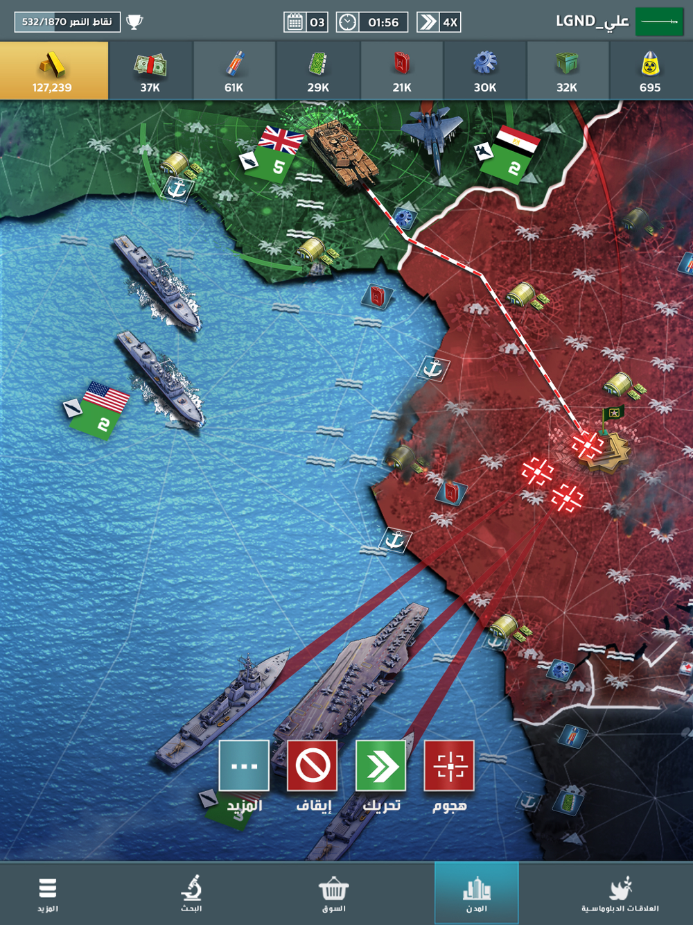 توفر لعبة الجنرال مساحة لعب ضخمة ووحدات عسكرية قوية وكثيرة وأساليب لا حصر لها لتحقيق هدفك المنشود بالسيطرة على العالم! انضم لملايين اللاعبين العرب وقم بوضع خطتك الاستراتيجية المُحكمة وقُد قواتك لتحقيق النصر. ارتفع بالمراتب واحتل مركزًا مرموقًا بين أفضل اللاعبين وكن أنت الجنرال.