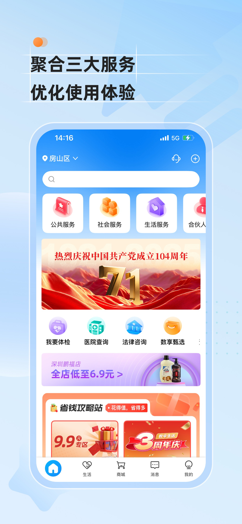 数享生活2.0版本上线政务发布系统,助力用户打通获取政务信息“盲点”,采用全新logo和主体视觉,更新桌面图标、启动页、首页背景图,优化视觉体验。生成大厅专属邀请链接,优化新用户拓客路径。上线“量子鞋专场活动”,为用户提供质优价廉的商品。启用全新slogan,“省心、省事、省力”,更加贴近百姓生活。