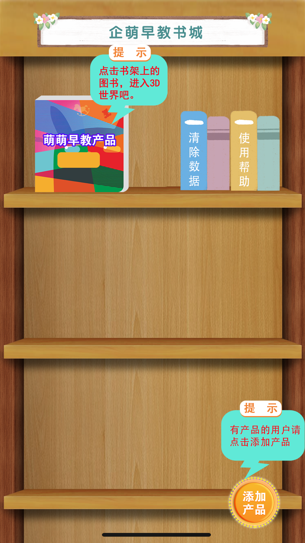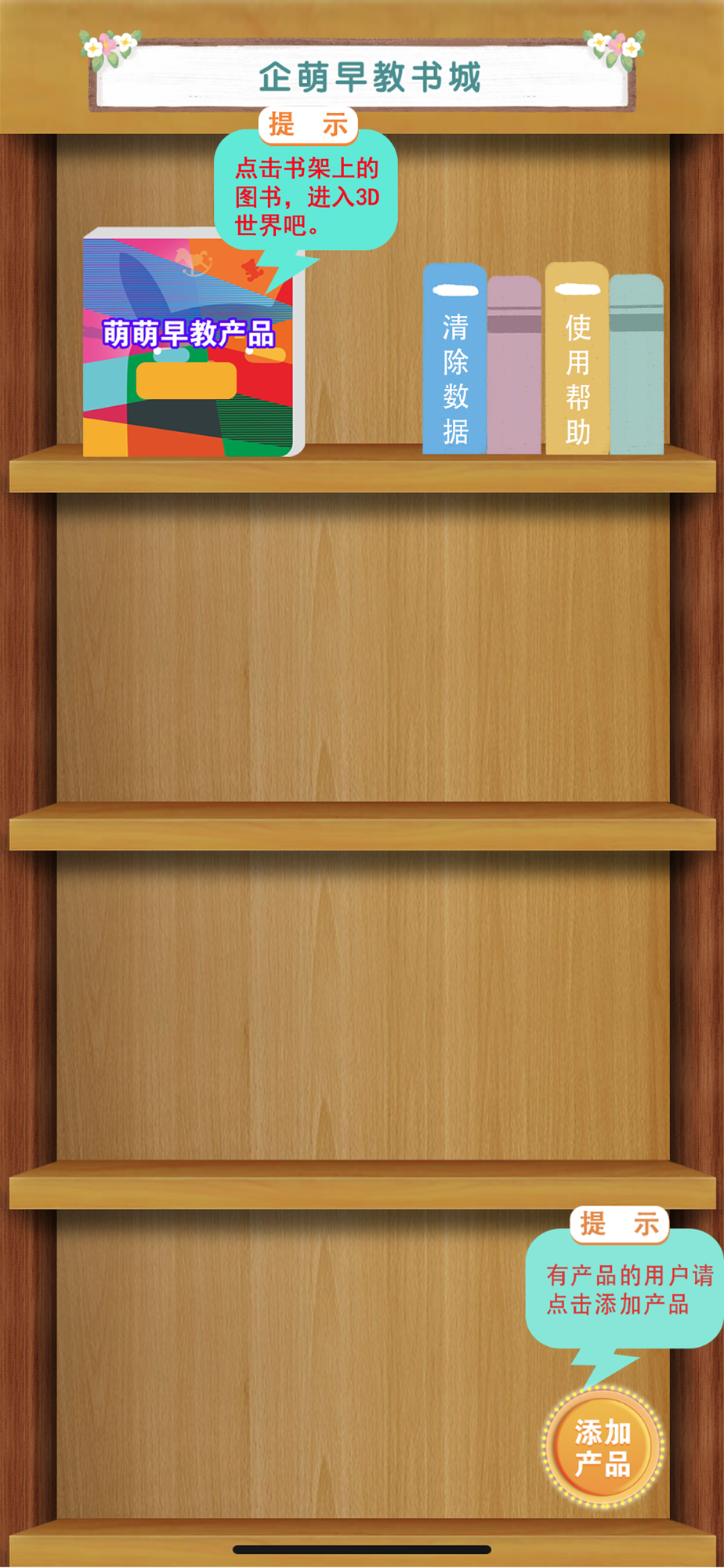《企萌早教书城》是一款早教学习软件,用户点击“添加产品”通过扫描配套图书产品的识别码添加产品的电子版本,体验产品配套的多媒体互动内容。没有产品的用户也可以点击书架上的自带图书,体验各种多媒体功能。