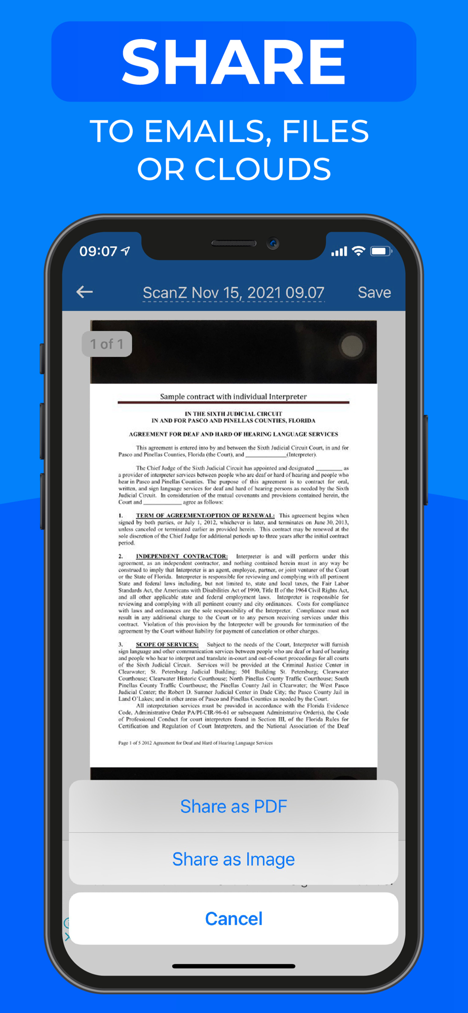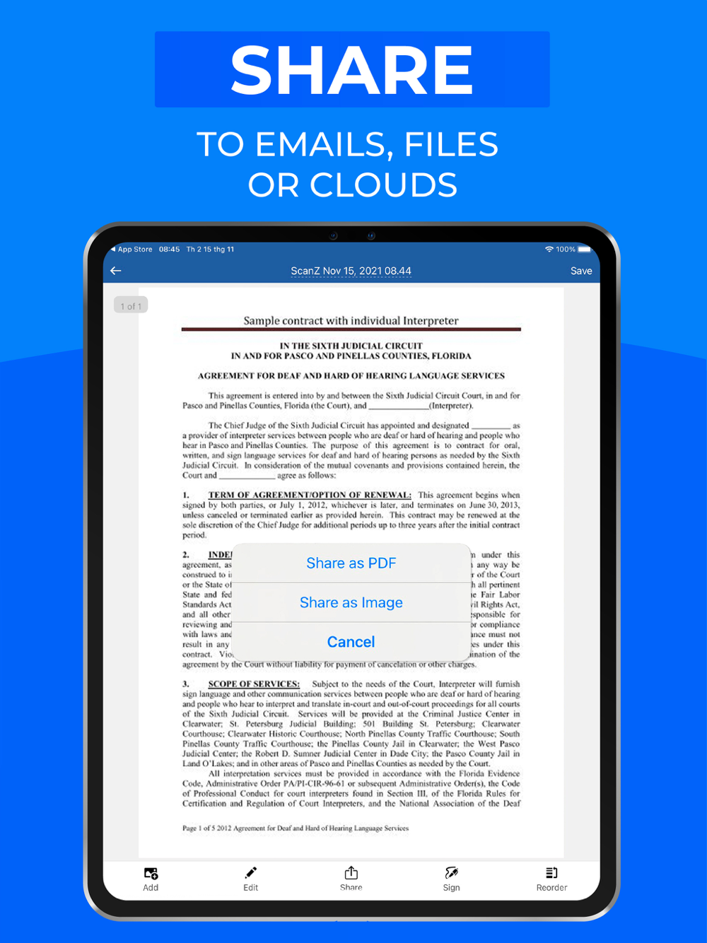 Scanner Z instantly scan, save, and share any documents in PDF, JPG formats.