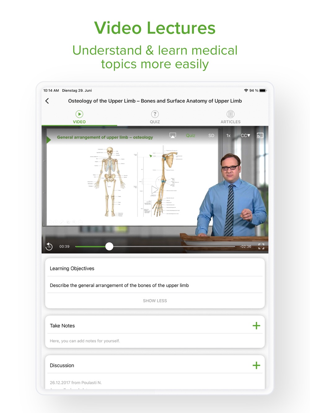 • Study interactively with 3D anatomy models and integrated quiz questions and take summary notes for each lecture.