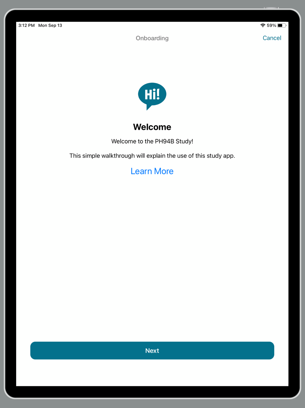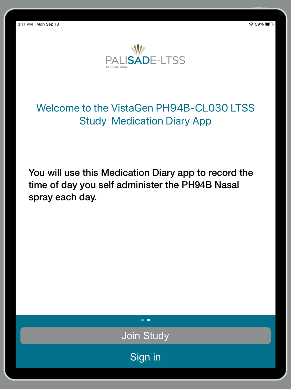 The PALISADE LTS (PH94B-CL030) study app is designed to collect patient-reported data from consented study participants. The app is secure and compliant with applicable regulations.