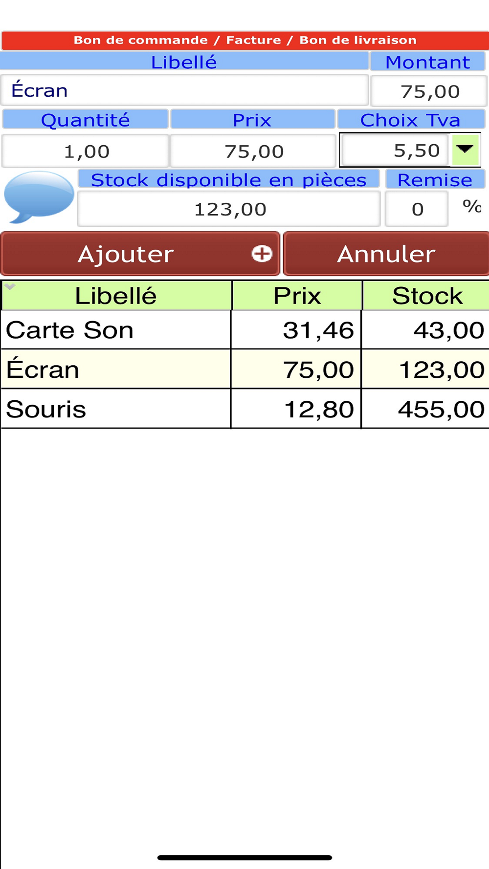 Gestion de stock, bon de commande, bon de livraison, facturation, relances client.