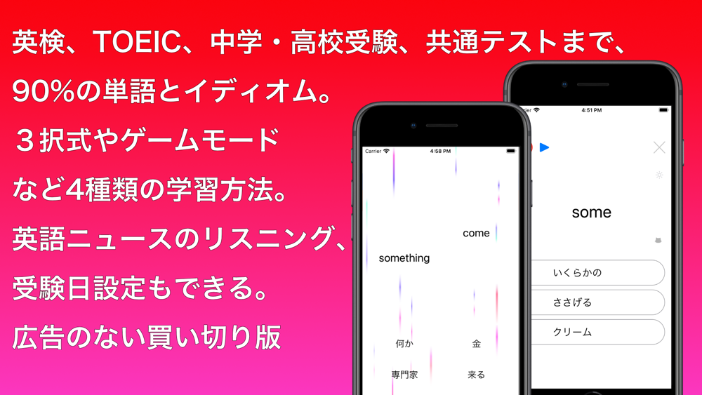 英検、TOEIC、共通テスト、高校受験、中学受験に対応した。統合版の英単語アプリ。広告のない買い切り版となります。無料版のspeed英単語シリーズをご利用中の方は、成績とMy単語帳のデータを引き継ぐことができます。