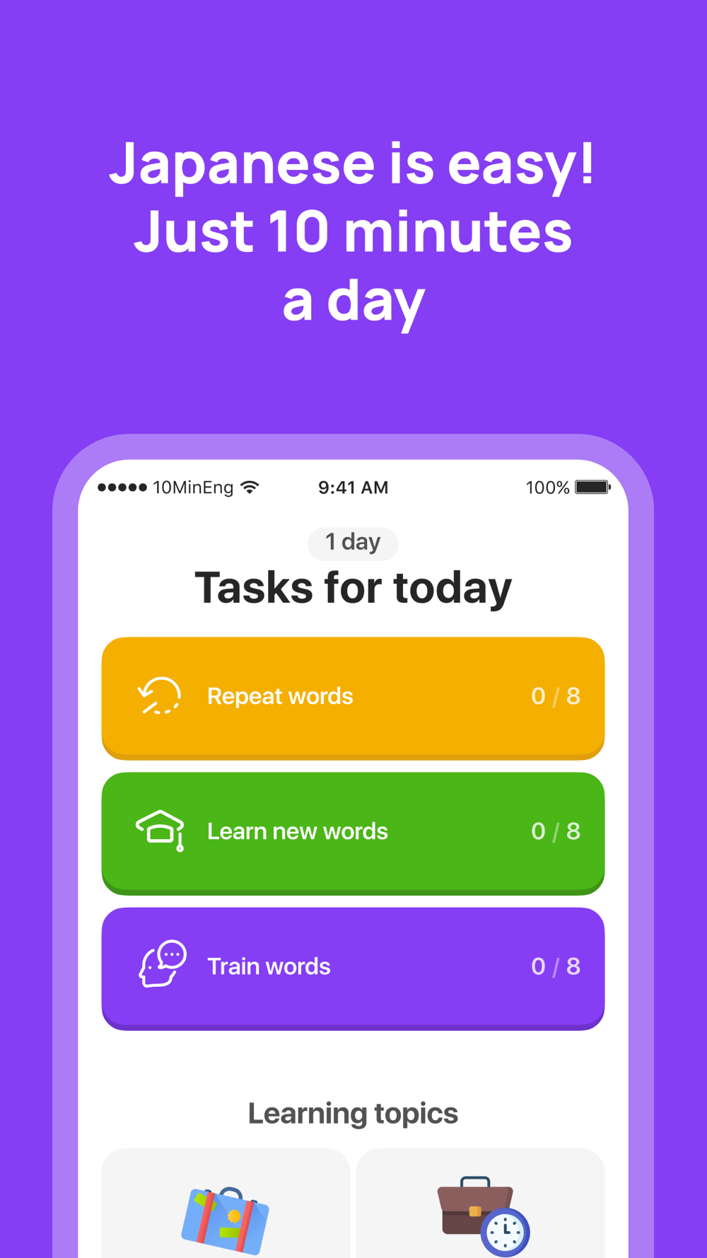 With the 10-Minute Japanese app, you are going to get better at speaking and understanding the language by expanding your vocabulary—over 500 new words in a month, each month.