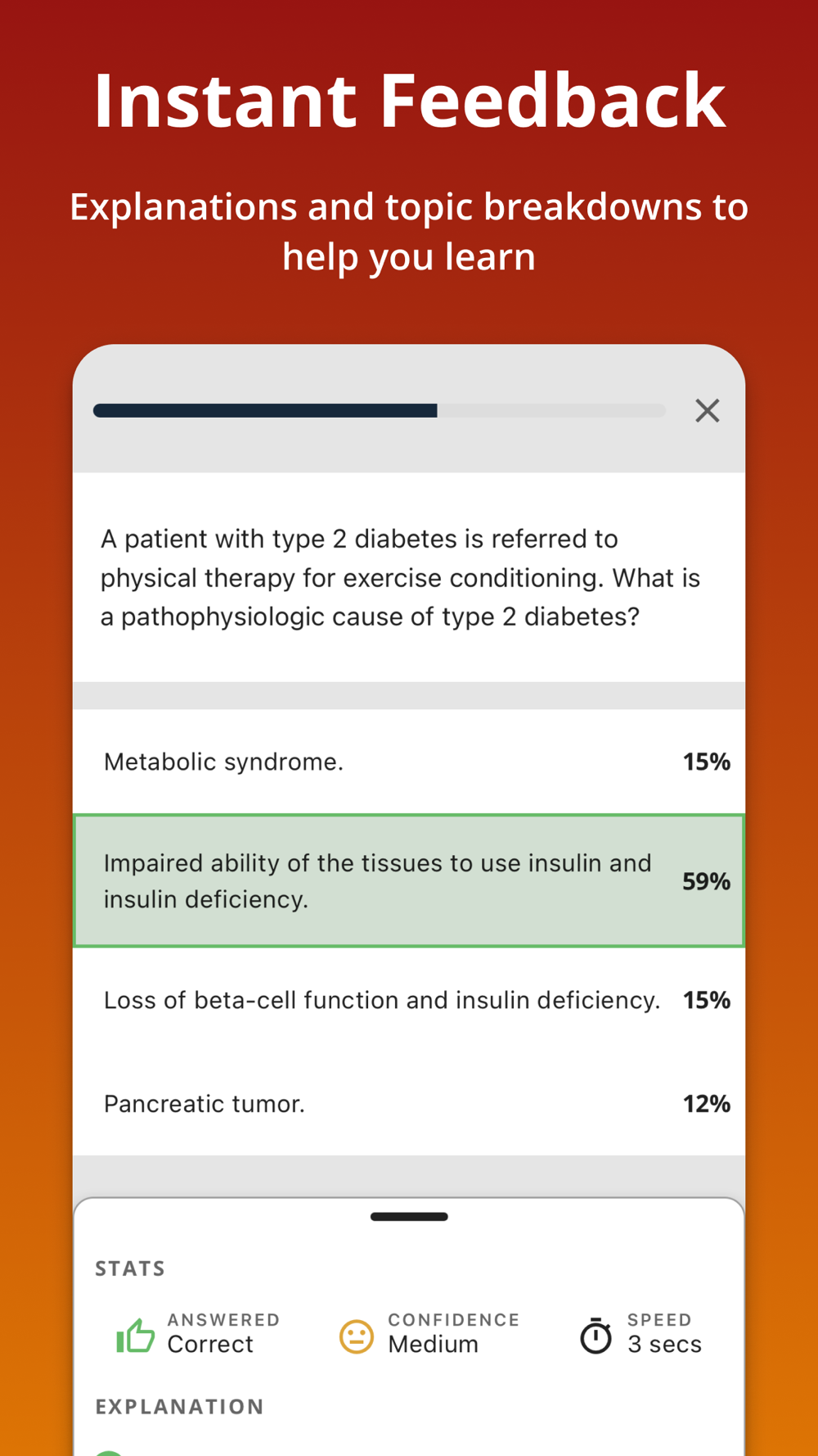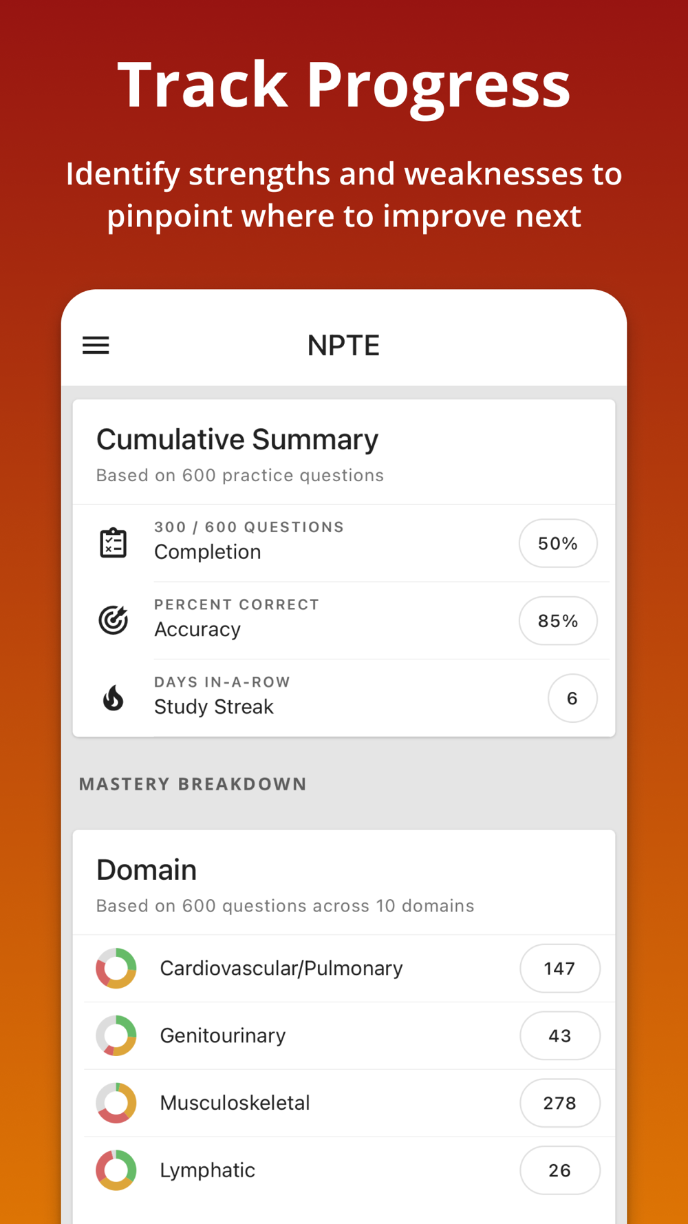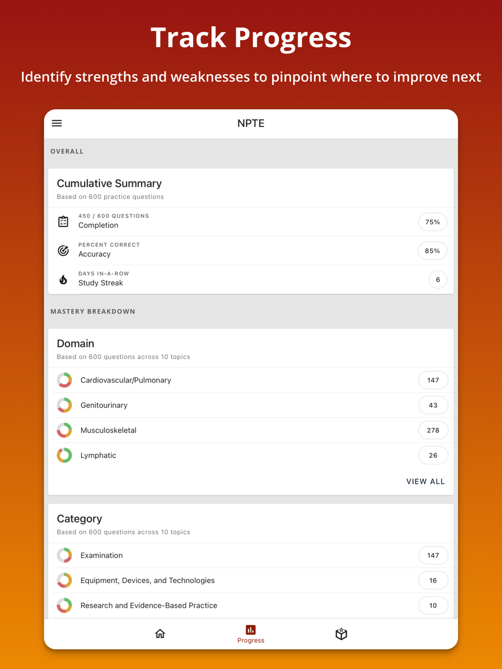 The TherapyEd Mobile App is your best streamlined mobile companion to help you pass your NPTE, PTA, and SLP PRAXIS exams. Each Study-Pack contains hundreds of comprehensive practice questions with detailed explanations integrated to the TherapyEd review & study guides. You can generate custom study sessions based on your mastery and filter by core domains, categories, and reasoning strategies. Additionally, you can track your progress and know where to improve next in real-time as you answer questions.