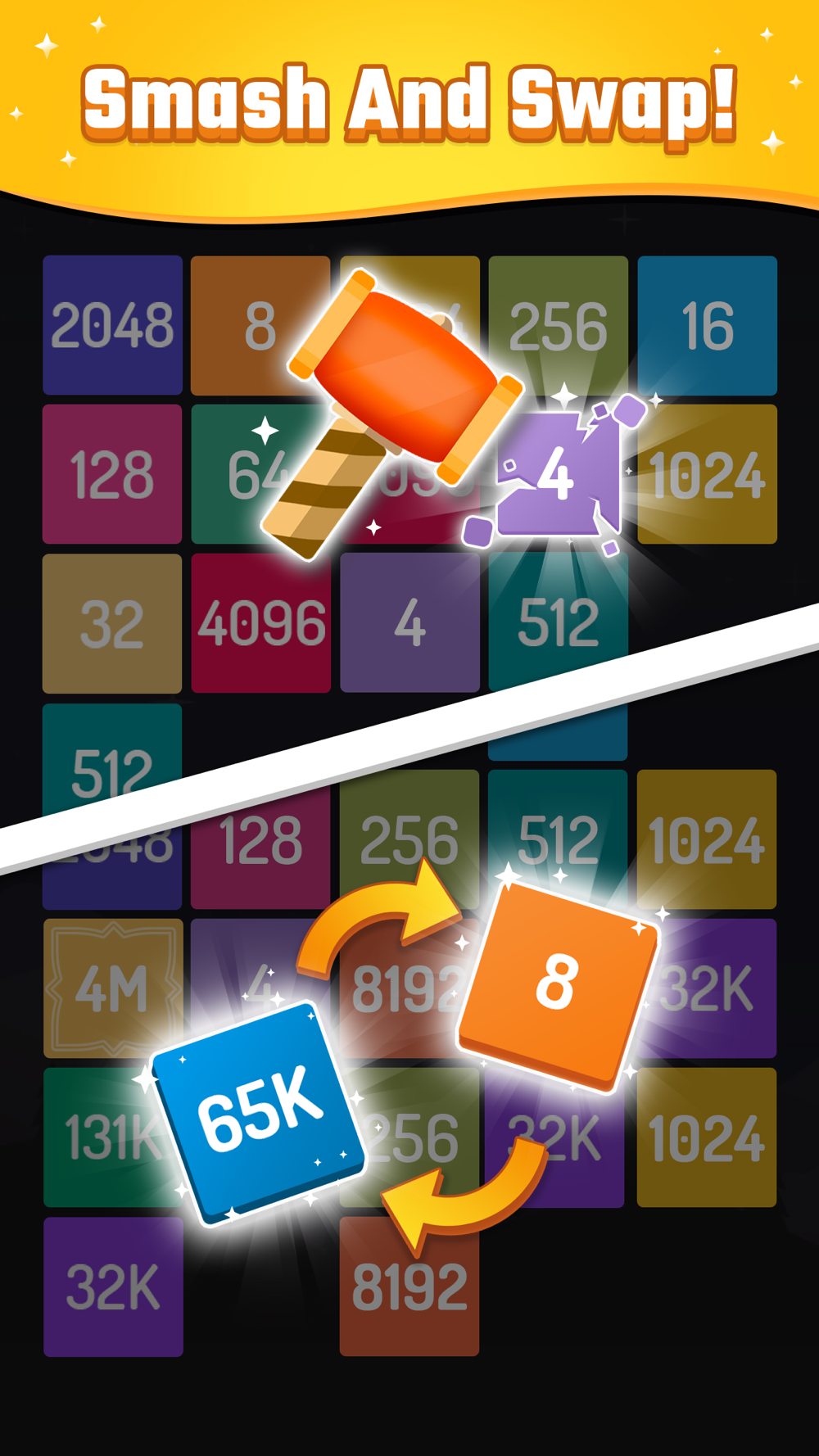1. Make the same numbers merge together by shooting them, expanding them 2x like this: 2, 4, 8, 16, 32 ...512...2048∞