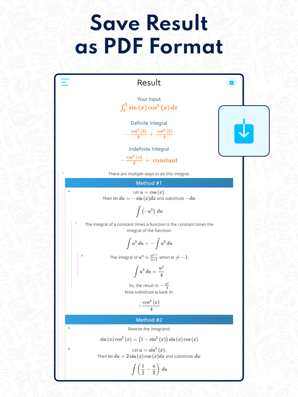 Integration is the process of combining small functions as a single one. It is the opposite operation of differentiation. This online integral calculator with steps helps you to calculate integral of a differentiable function.