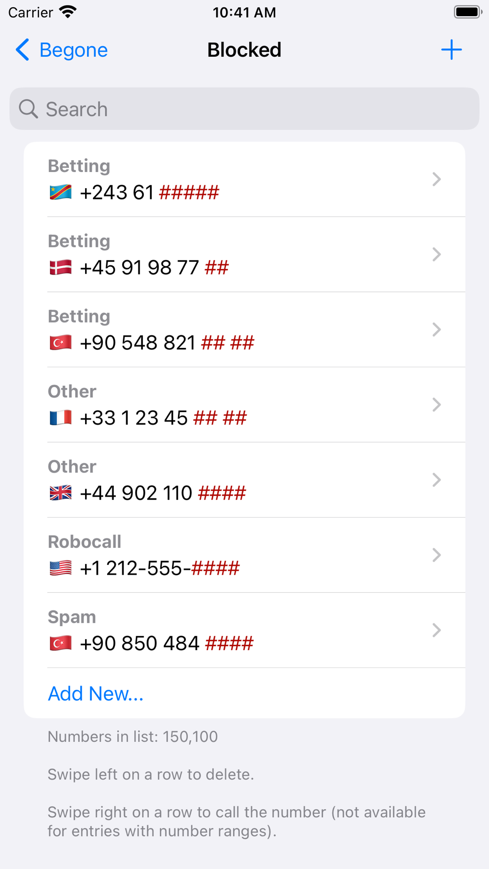 Begone uses a simple wildcard character mechanism to add numbers into its database. You can use the # character as the wildcard. For example, when you enter +1 212-555-#### to its block list, Begone blocks the numbers from +1 212-555-0000 to +1 212-555-9999. This way, you can immediately block tens of thousands of numbers with one simple entry.