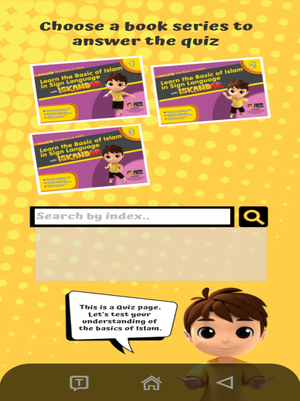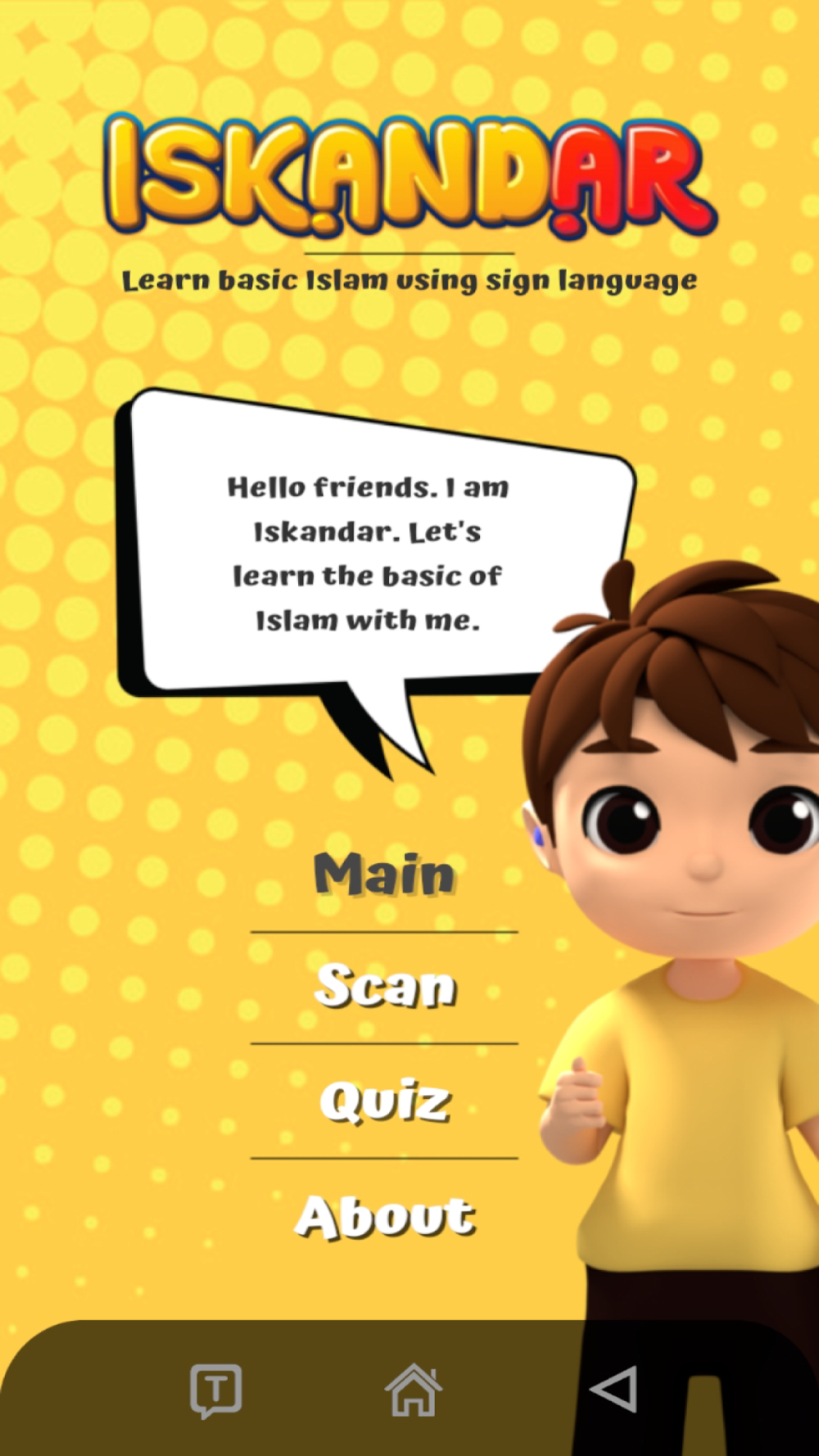 This application is to help the OKU Deaf community in learning the basics of Islam using Malaysian Sign Language focused on children aged 6-12 years.