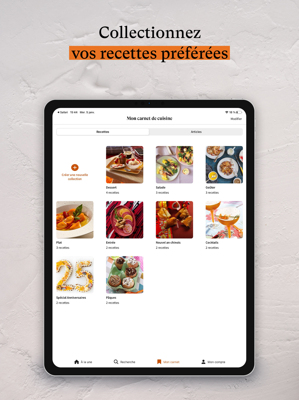 Créez votre propre carnet de recettes, et retrouvez à tout moment votre sélection, y compris en mode déconnecté.