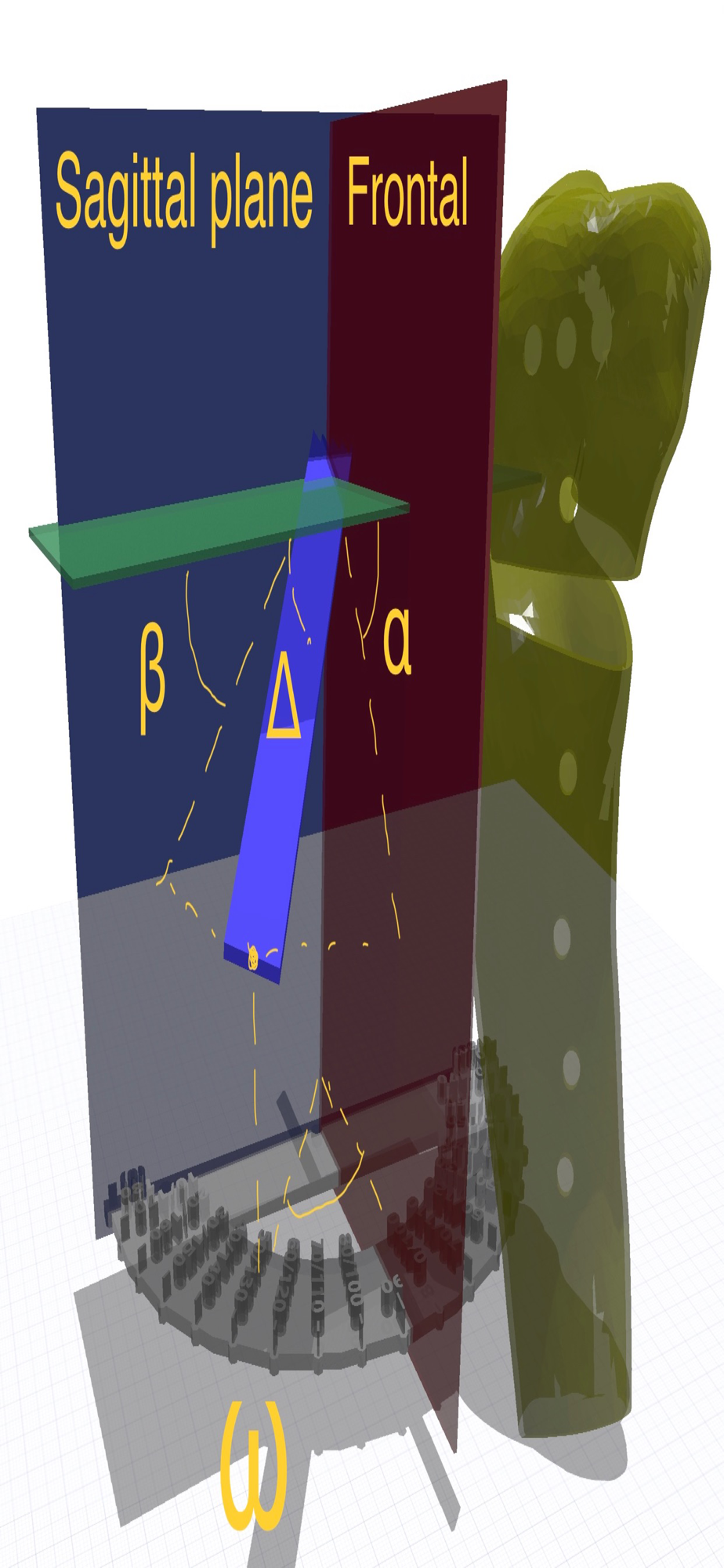 - to combine correction - namely biplanar- at coronal plane (a angle) and sagittal plane (β angle) by real time measuring the previous angles, tibia slope, tibia torsion and provides the direction of the osteotomy plane (ω angle) in which (open or closed) should be made, the height the opening or closing of the wedge and the correction angle (Δ angle) which values are update in real time continuously.