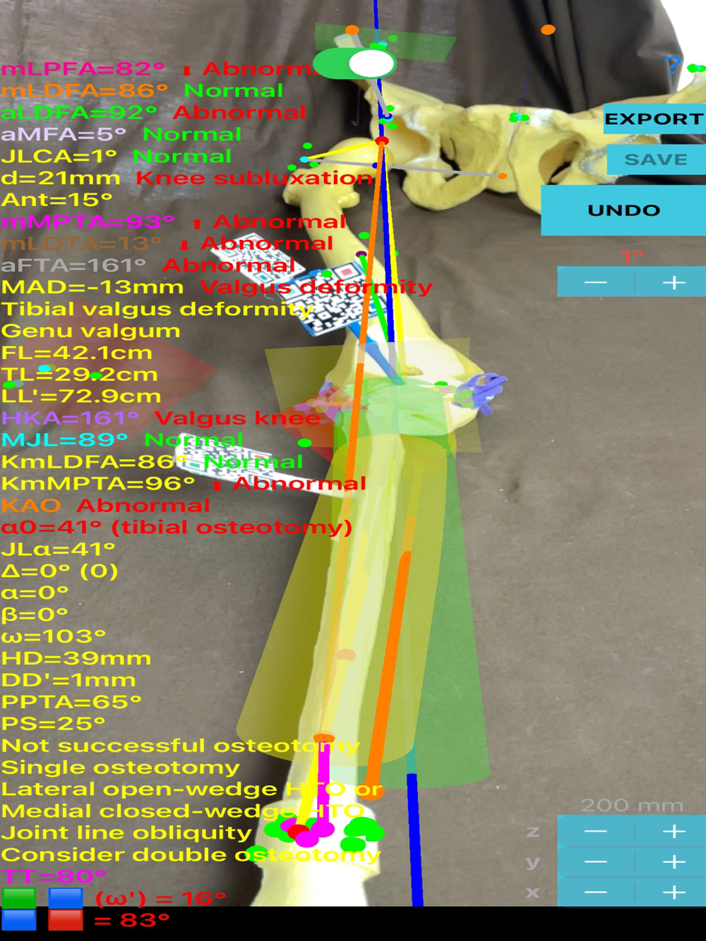 - calculations in a instant of the mechanical axis deviation (in mm) MAD, anatomical and mechanical femoral axes angle (aMFA), mechanical lateral proximal femoral angle (mLPFA), mechanical lateral distal femoral angle(mLDFA), joint line convergence angle (JLCA), mechanical medial proximal tibial angle (mMPTA), mechanical lateral distal tibial angle (mLDTA), Hip Knee Ankle line (HKA) and Mid joint line (MJL). orientation that gives the surgeon valuable objective informations.