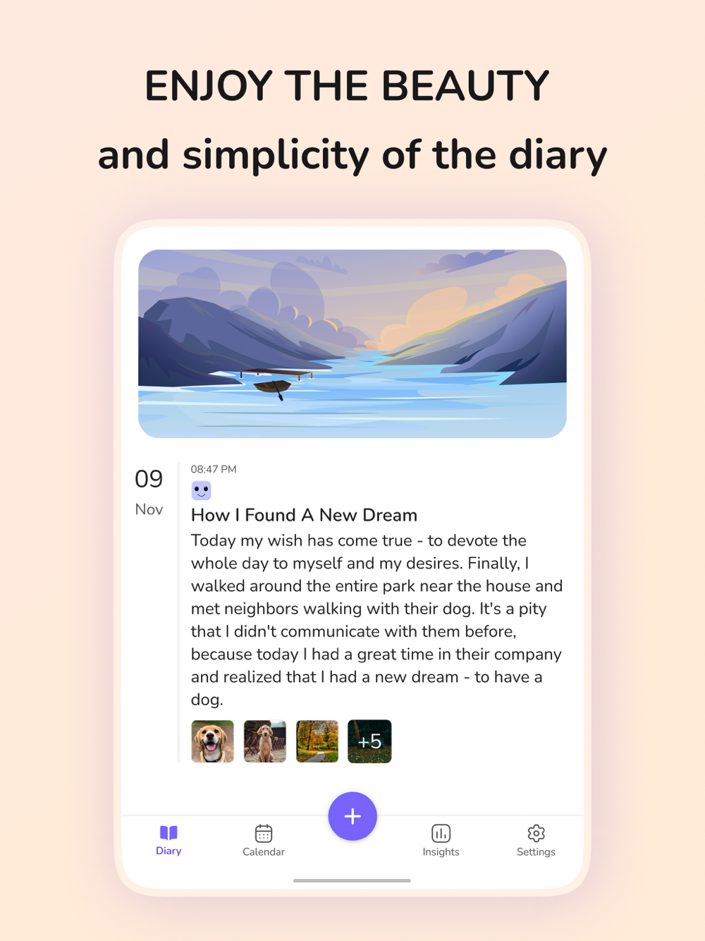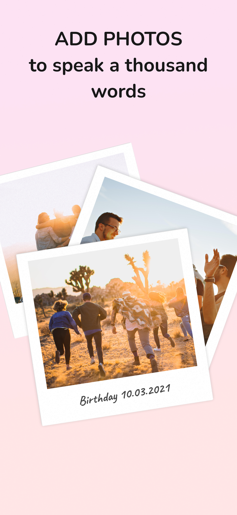 You can write your thoughts, feelings or experiences and attach photos. Even little notes each day help to organize your inner thoughts and gain clarity on your priorities.