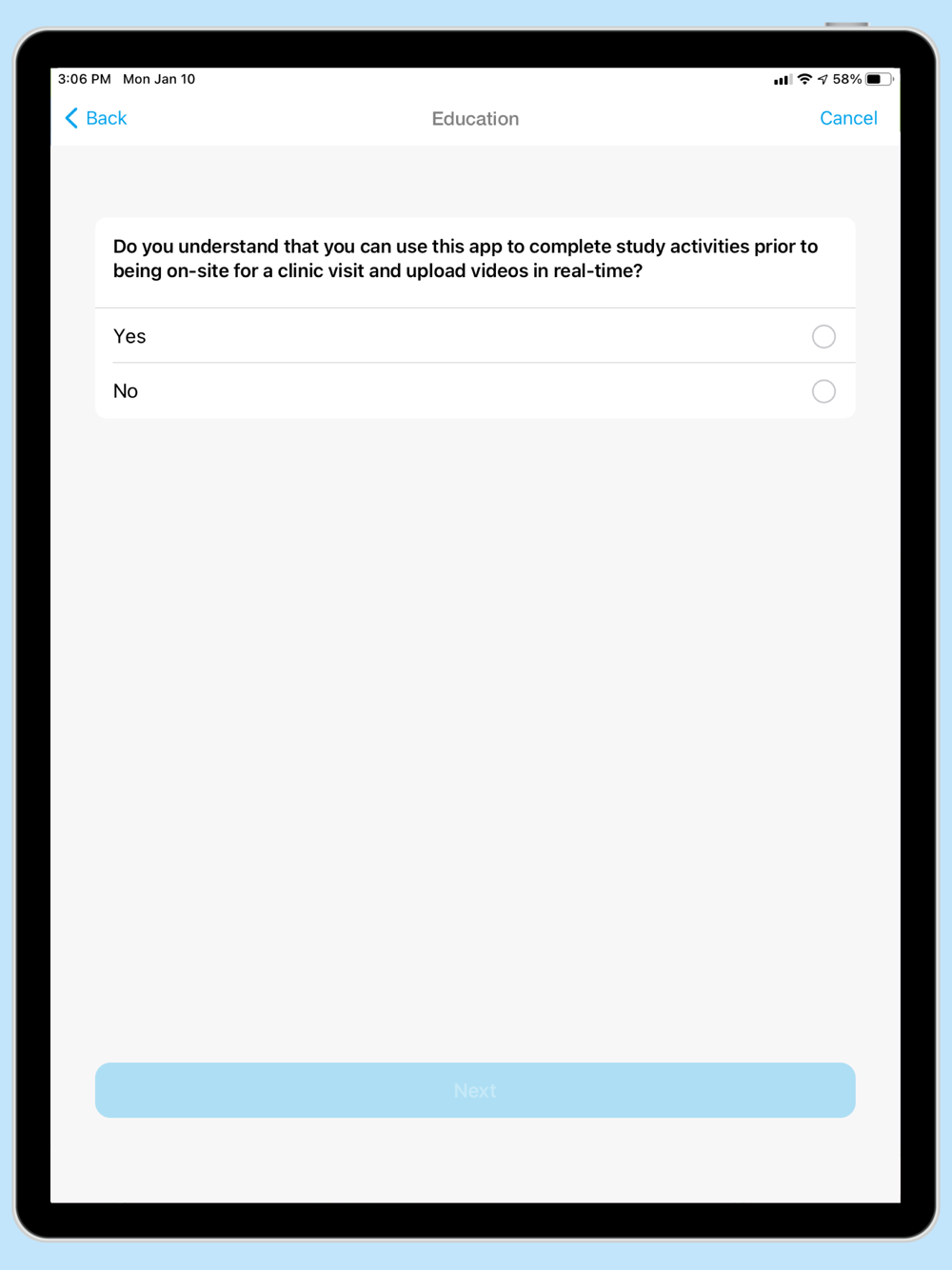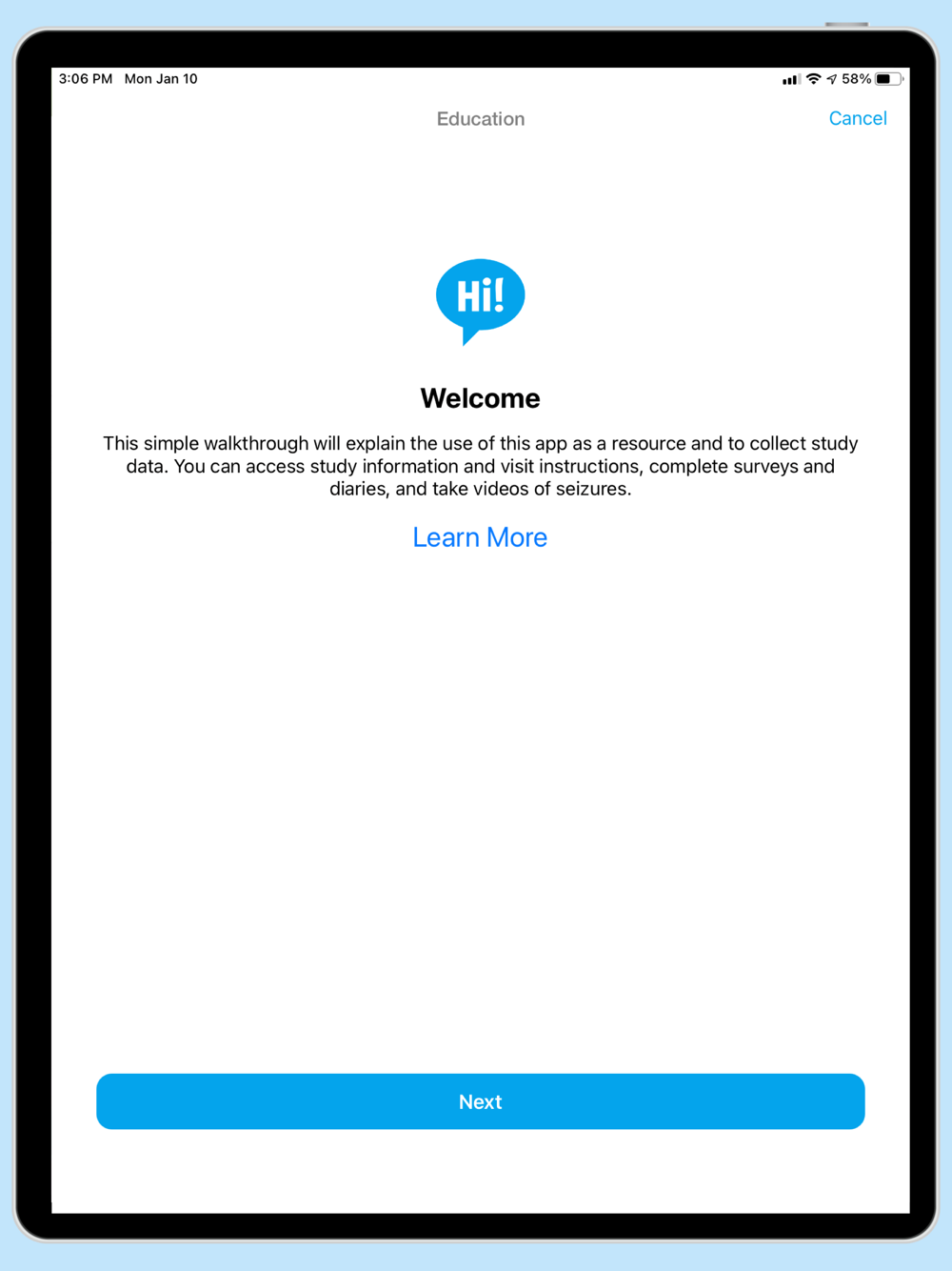 This simple walkthrough will explain how to use this app as a resource and collect study data. You can access study information and visit instructions, complete surveys and diaries, and take videos of seizures.