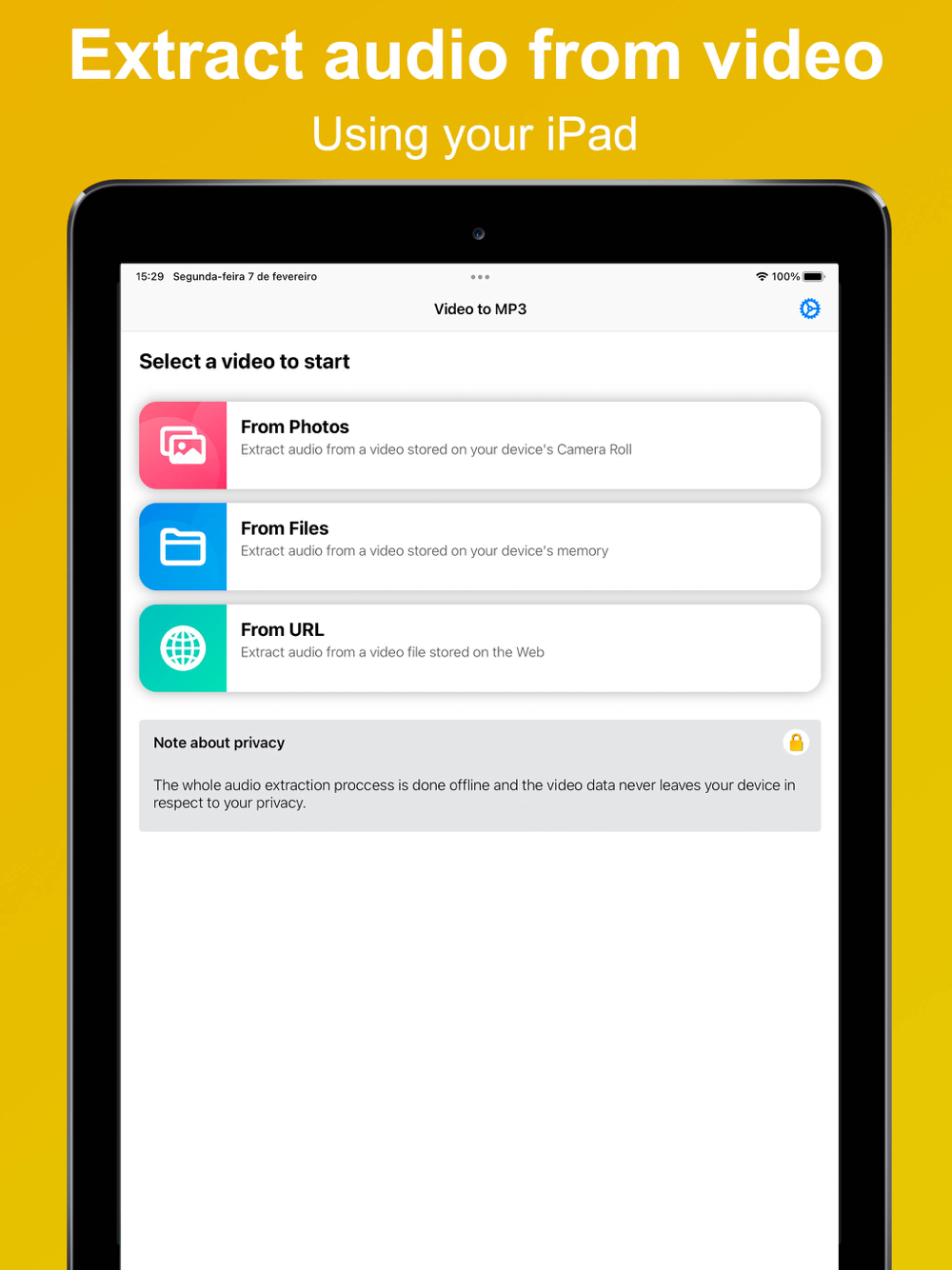 Video to MP3 works offline, using the power of your device to convert video into audio. Your media is not sent to the Internet or any other external service in respect to your data privacy.