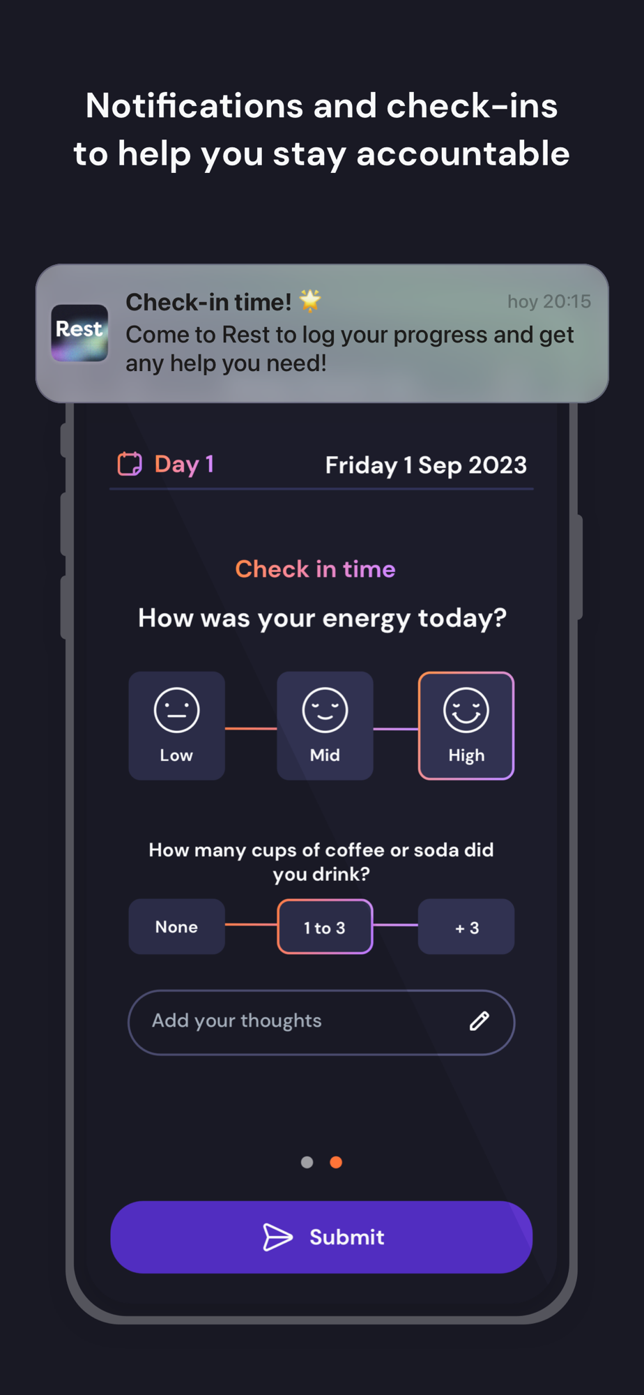 - Habit forming Tools: We’ll keep you on track with notifications, reminders and energy check-ins to help you stay accountable