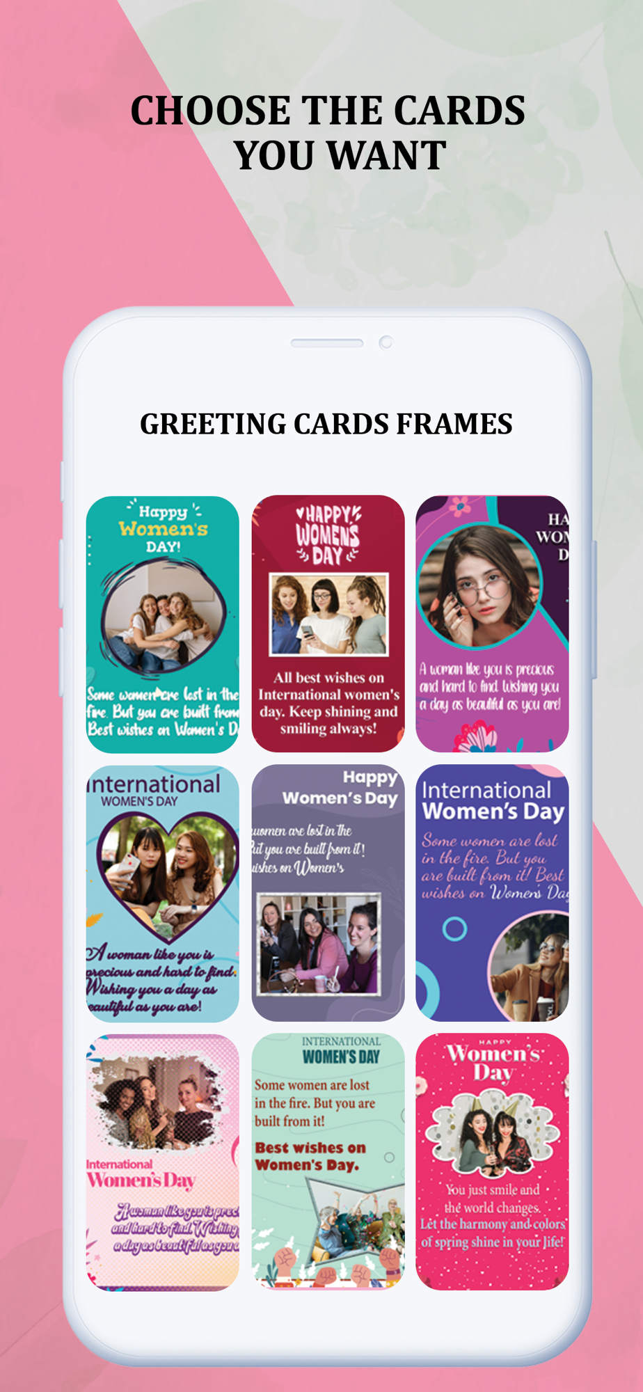 Choose photos from gallery or take new photo with camera, select a frame and generate your beautiful womens day photo frames.