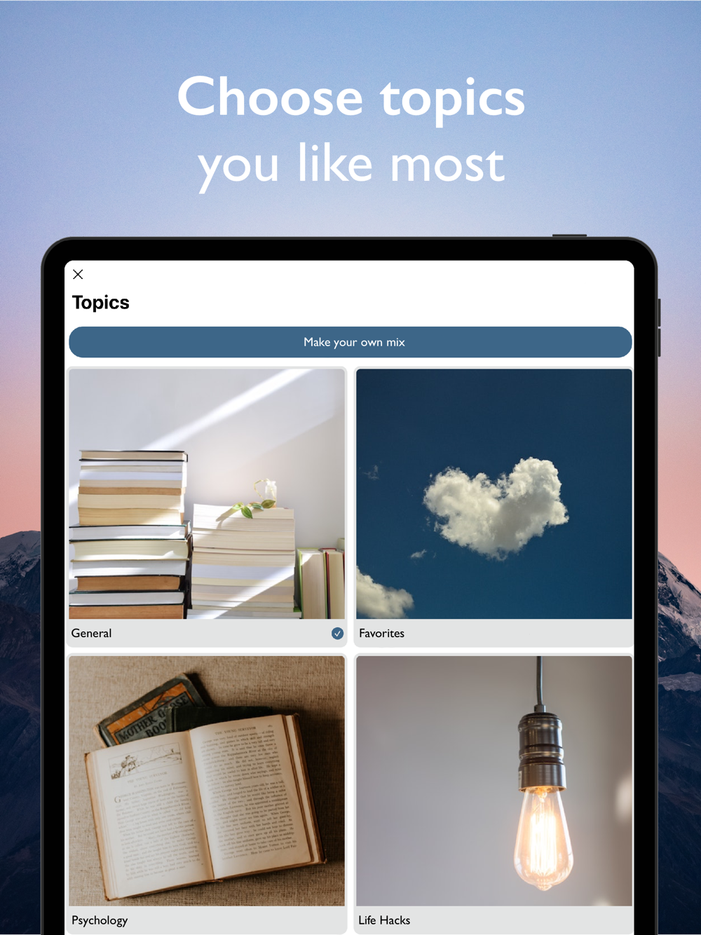 In our app you can find a wide range of topics from World, Technology to Life Hacks.