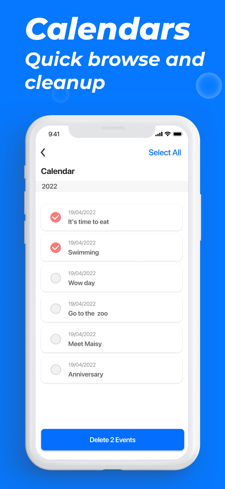 - Quickly clean up calendar events and contacts with one click