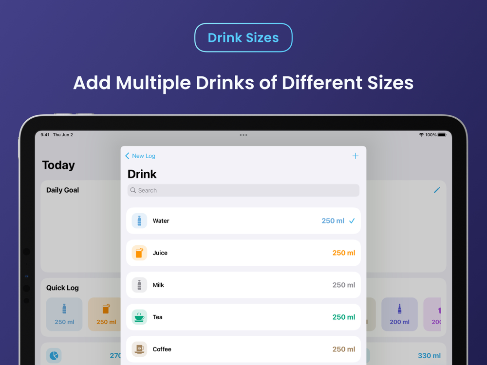 - 3 Different Home Screen widgets that you can use to quickly add a log, view the completion of your daily goal or just view your previously added logs