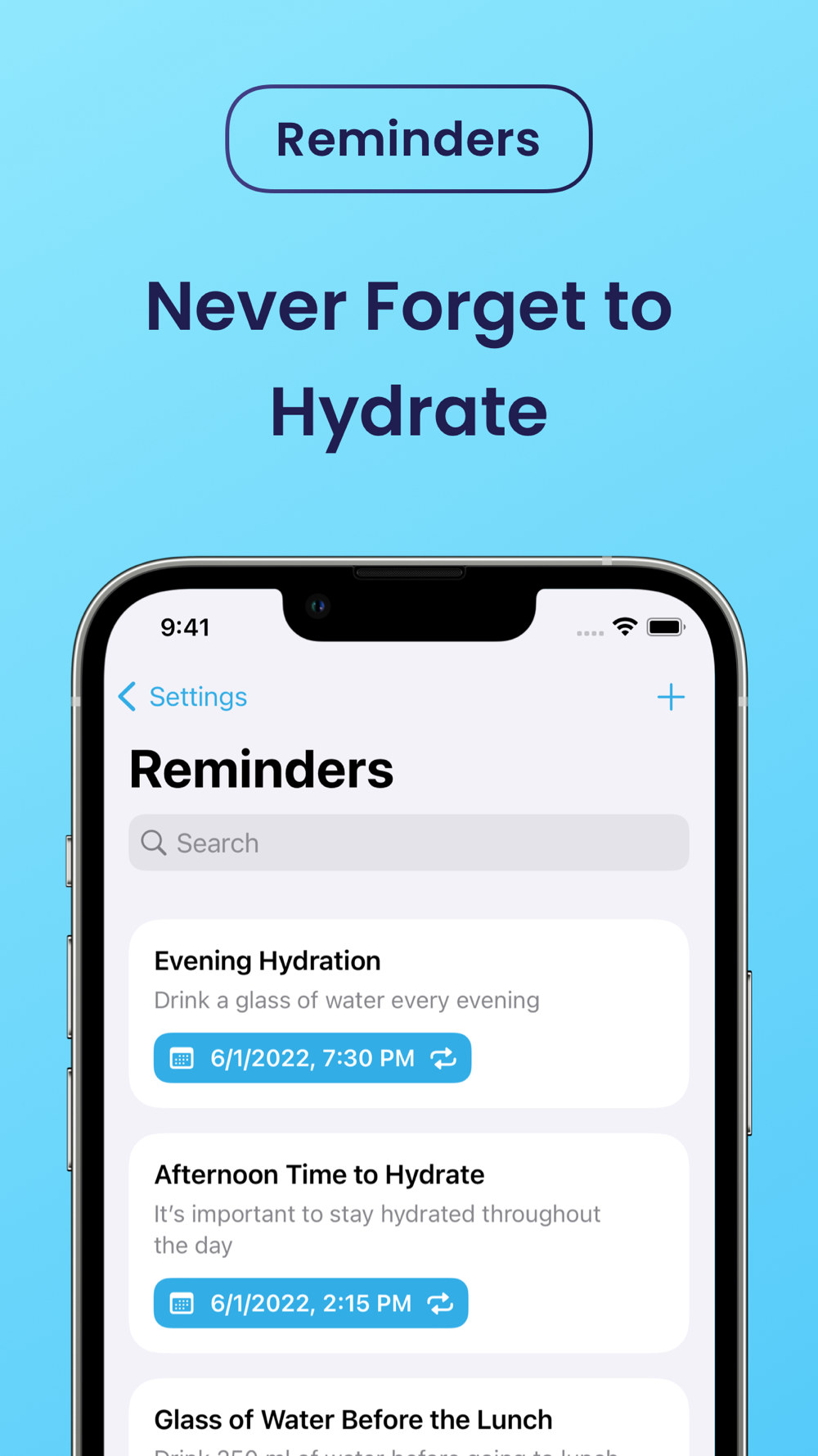 - Unlimited number of reminders that you can schedule to never forget to hydrate