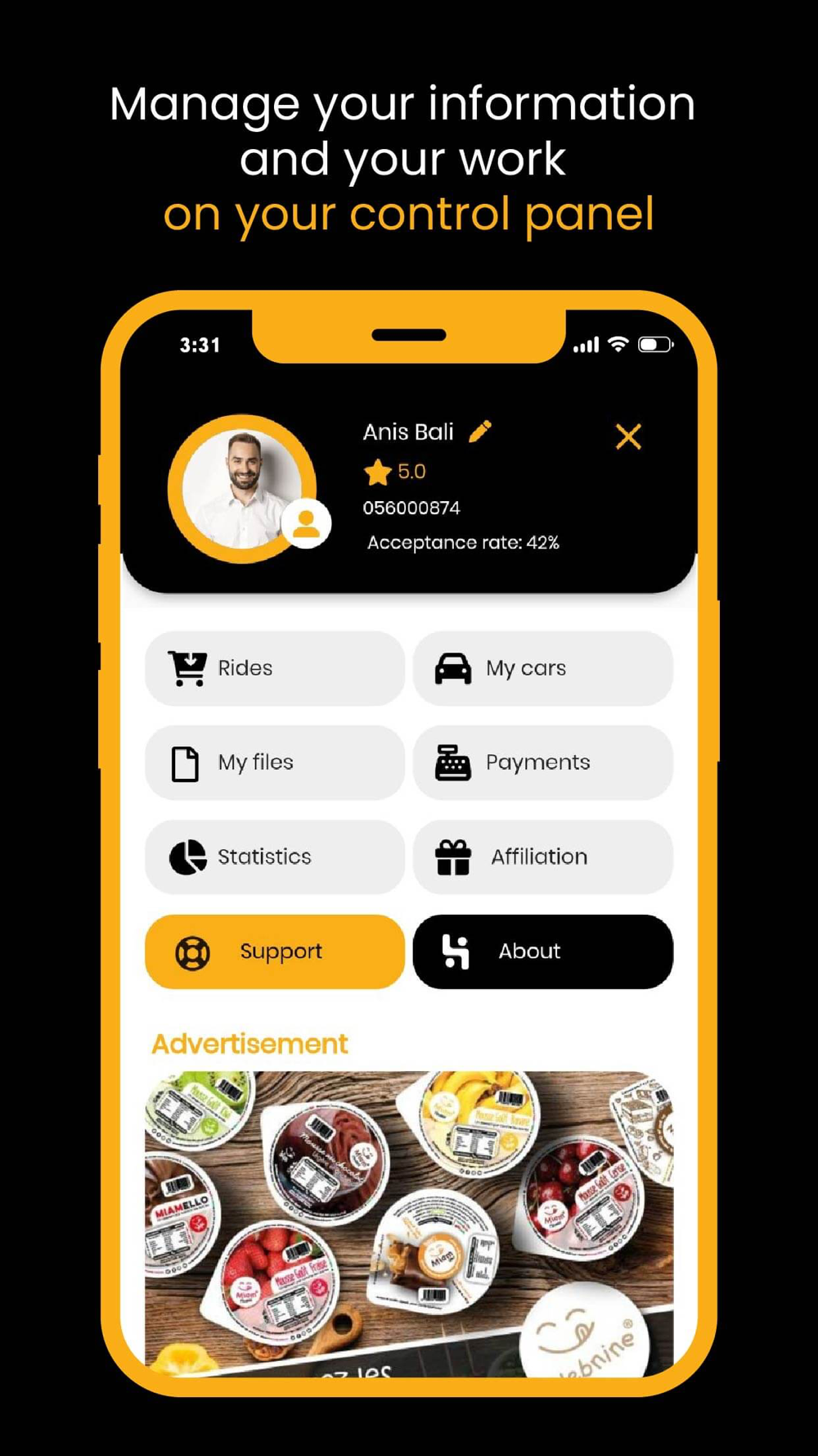 Anyone who owns a recent vehicle and wants to work either on a full-time or occasional basis can apply to provide their services to customers through our application in just a few clicks and receive 100% of the profits.